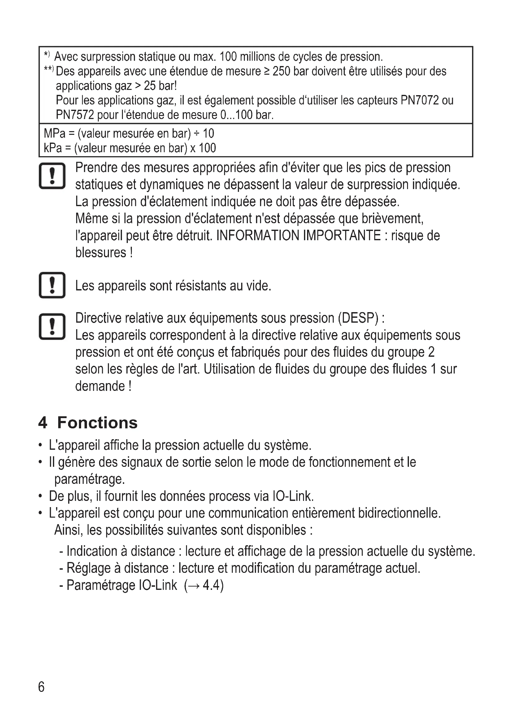 Des appareils avec une étendue de mesure ≥ 250 bar doivent être utilisés pour des applications gaz > 25 bar! Pour les applications gaz, il est également possible d‘utiliser les capteurs PN7072 ou PN7572 pour l‘étendue de mesure 0100 bar MPa = (valeur mesurée en bar) ÷ 10 kPa = (valeur mesurée en bar) x 100 Prendre des mesures appropriées afin d'éviter que les pics de pression statiques et dynamiques ne dépassent la valeur de surpression indiquée La pression d'éclatement indiquée ne doit pas être dépassée Même si la pression d'éclatement n'est dépassée que brièvement, l'appareil peut être détruit INFORMATION IMPORTANTE : risque de blessures ! Les appareils sont résistants au vide Directive relative aux équipements sous pression (DESP) : Les appareils correspondent à la directive relative aux équipements sous pression et ont été conçus et fabriqués pour des fluides du groupe 2 selon les règles de l'art Utilisation de fluides du groupe des fluides 1 sur demande ! 4 Fonctions