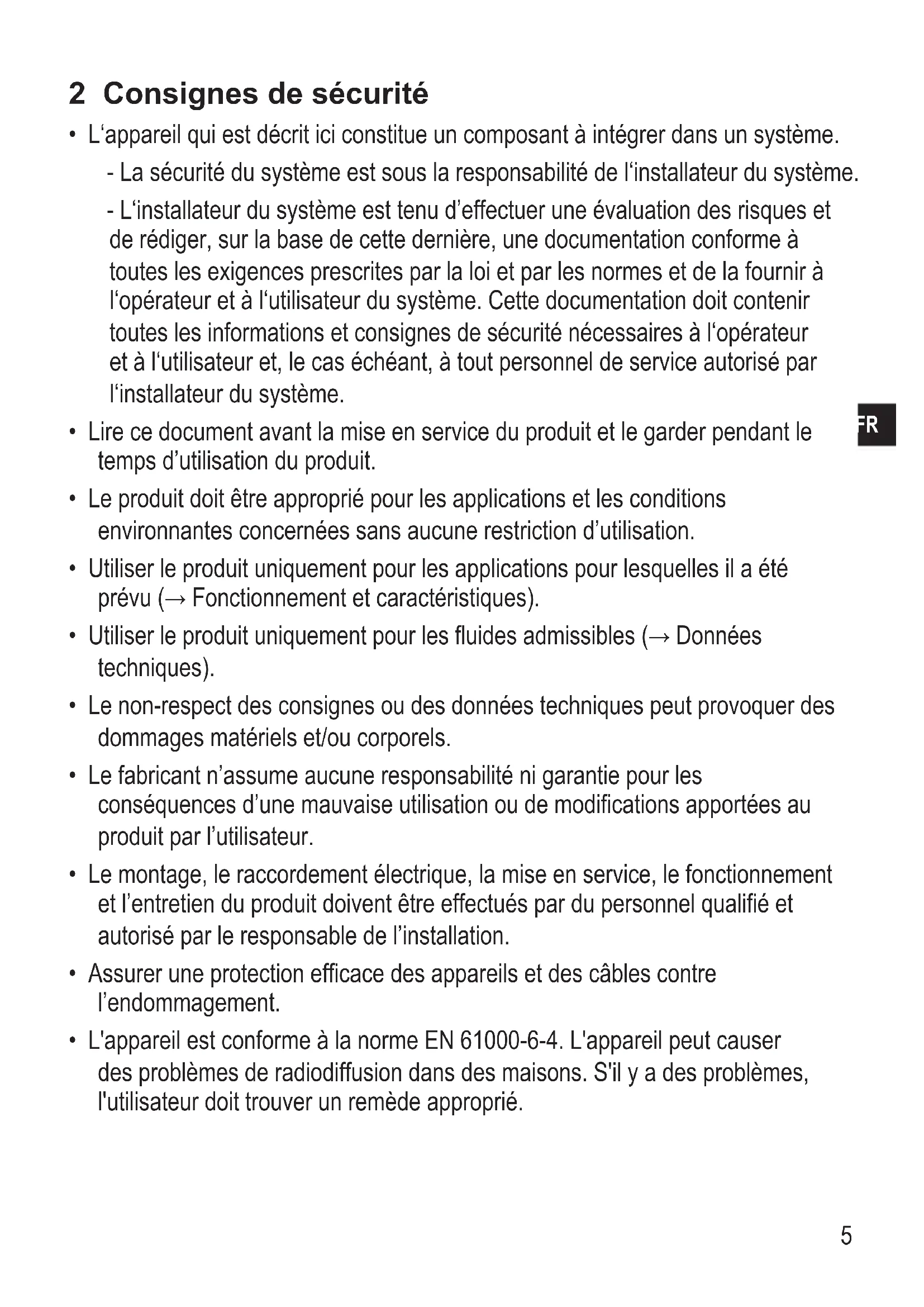- L‘appareil qui est décrit ici constitue un composant à intégrer dans un système - La sécurité du système est sous la responsabilité de l‘installateur du système - L‘installateur du système est tenu d’effectuer une évaluation des risques et de rédiger, sur la base de cette dernière, une documentation conforme à toutes les exigences prescrites par la loi et par les normes et de la fournir à l‘opérateur et à l‘utilisateur du système Cette documentation doit contenir toutes les informations et consignes de sécurité nécessaires à l‘opérateur et à l‘utilisateur et, le cas échéant, à tout personnel de service autorisé par l‘installateur du système