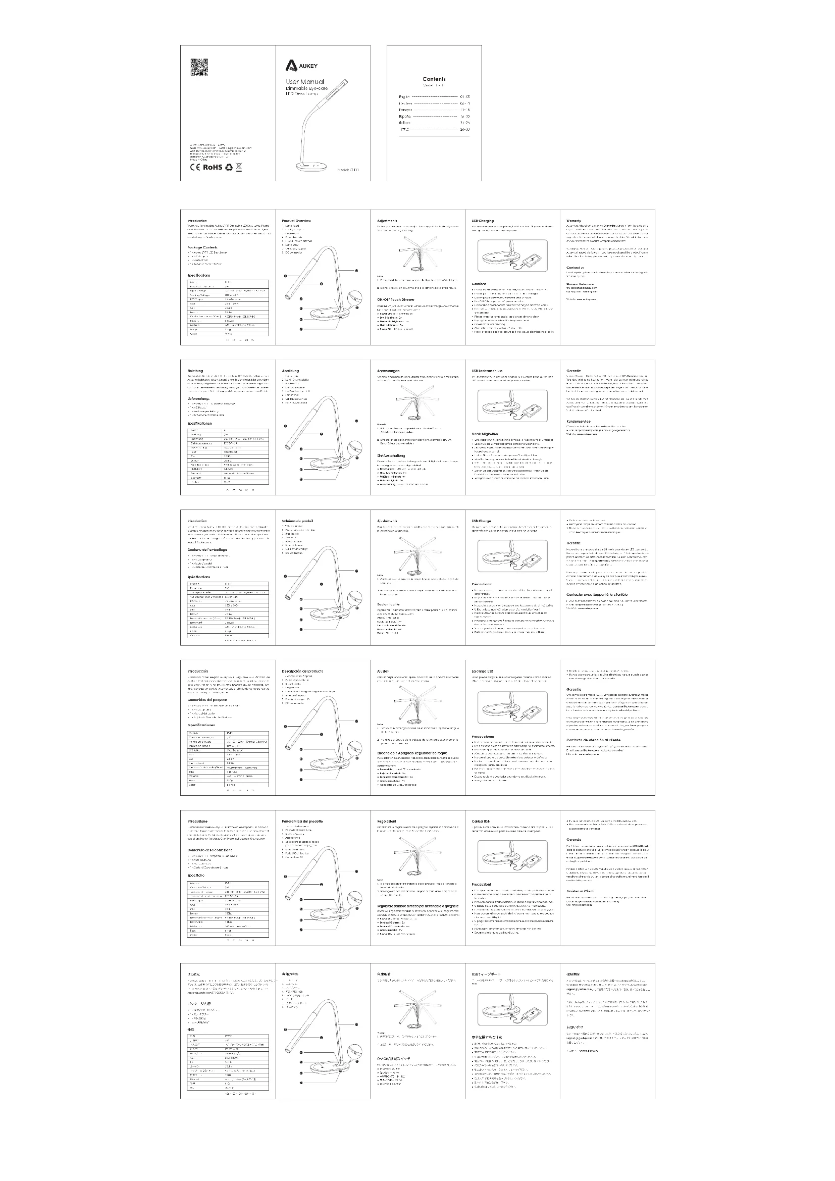 - 11 - - 12 - - 13 - - 14 - - 15 - Introduction Merci de choisir Aukey LT-T11 LED Lampe du Bureau avec luminosité ajustable. Veuillez lire ce mode d’emploi attentivement et conservez-le pour pouvoir y revenir ultérieurement. Si vous avez des questions, veuillez contacter le support à la clientèle de Aukey par email à support@aukey.com. Contenu de l’emballage ● 1 x Aukey LT-T11 Lampe du Bureau● 1 x AC Adaptateur● 1 x Mode d’emploi● 1 x Carte de Garantie de 24 Mois Spécifications ModèlePuissanceVoltage d’entréeVoltage de fonctionnementUSB Sortie CCT CRI LumenLuminosité centrale(30cm)Luminosité MateriauxPoidsCouleurLT-T11 AC 100-220V 50/60Hz 0.5A MAXDC 5V 2A5V 2A (Max)5500 ± 300K≥80Ra380LM900LUX(Max); 100LUX(Min)3 LevelsABS + Aluminium + Silicon 810g Blanc Schéma du produit 1. Tête de lampe2. Plaque à guider la lumière3. Bras flexible4. Axe rotatif5. Bouton tactile6. Base de lampe7. USB Port de charge8. DC connecteur Ajustements Pour la meilleure performance, veuillez ajuster la position de plaque de la lampe selon vos besoins.Note:1. Veuillez presser la base de la lampe lorsque vous adjustez l'angle de la lampe.2. Ne pas adjuster excessivement l'angle de la tête de la lampe pour éviter la panne. Bouton tactile Appuyez sur le bouton tactile va faire circuler parmi les cinq options d'éclairage dans l'ordre suivant:Allumé: LED s’allumeFaible luminosité: 2WLuminosité modérée: 4wHaute luminosité: 7WEteint: LED s’éteint Précautions: ● Ne pas réparer, désassembler ni modifier dans n’importe quelle circonstance.● Ne pas la placer près d’une source de chaleur ou sous la lumière directe du soleil.● Ne pas la placer sur un bureau ou une table non-plats et insécurités.● Utiliser uniquement AC adaptateur d’alimentation fourni.● Ne pas utiliser les cordons d’appareils électriques effilochés ou endommagés. ● Ne pas toucher appareil électrique avec les mains mouillées ou lorsque des liquides sont présents.● Veuillez garder la lampe et toutes ses parties secs et propres.● Débrancher l’adaptateur lorsque la lampe n’est pas utilisée.● S’éteindre avant de la nettoyer.● Nettoyer la lampe seulement avec un chiffon doux et sec.● Ne jamais surcharger les circuits électriques car cela peut causer un choc électrique ou une incendie électrique. Garantie Nous offrons une garantie de 24 mois pour Aukey LED Lampe du Bureau à compter de la date de l’achat original. Si la lampe tombe en panne en raison de défauts de fabrication, veuillez contacter Aukey Support par email à support@aukey.com avec votre numéro de la commande et les détails de problème.Nous ne pouvons fournir que le service après-vente pour les produits achetés directement chez Aukey ou distributeur authorisé par Aukey. Si vous les avez achetés chez un vendeur différent, veuillez contacter avec le vendeur pour la demande de garantie. Contacter avec Support à la clientèle Si vous avez des questions ou besoin de l’aide, veuillez nous contacter: E-mail: support@aukey.com (toutes les questions)Site Web: www.aukey.com USB Charge Vous pouvez charger votre smartphone, tablette ou autres appareils alimentés par USB via le port USB sur la base de la lampe.