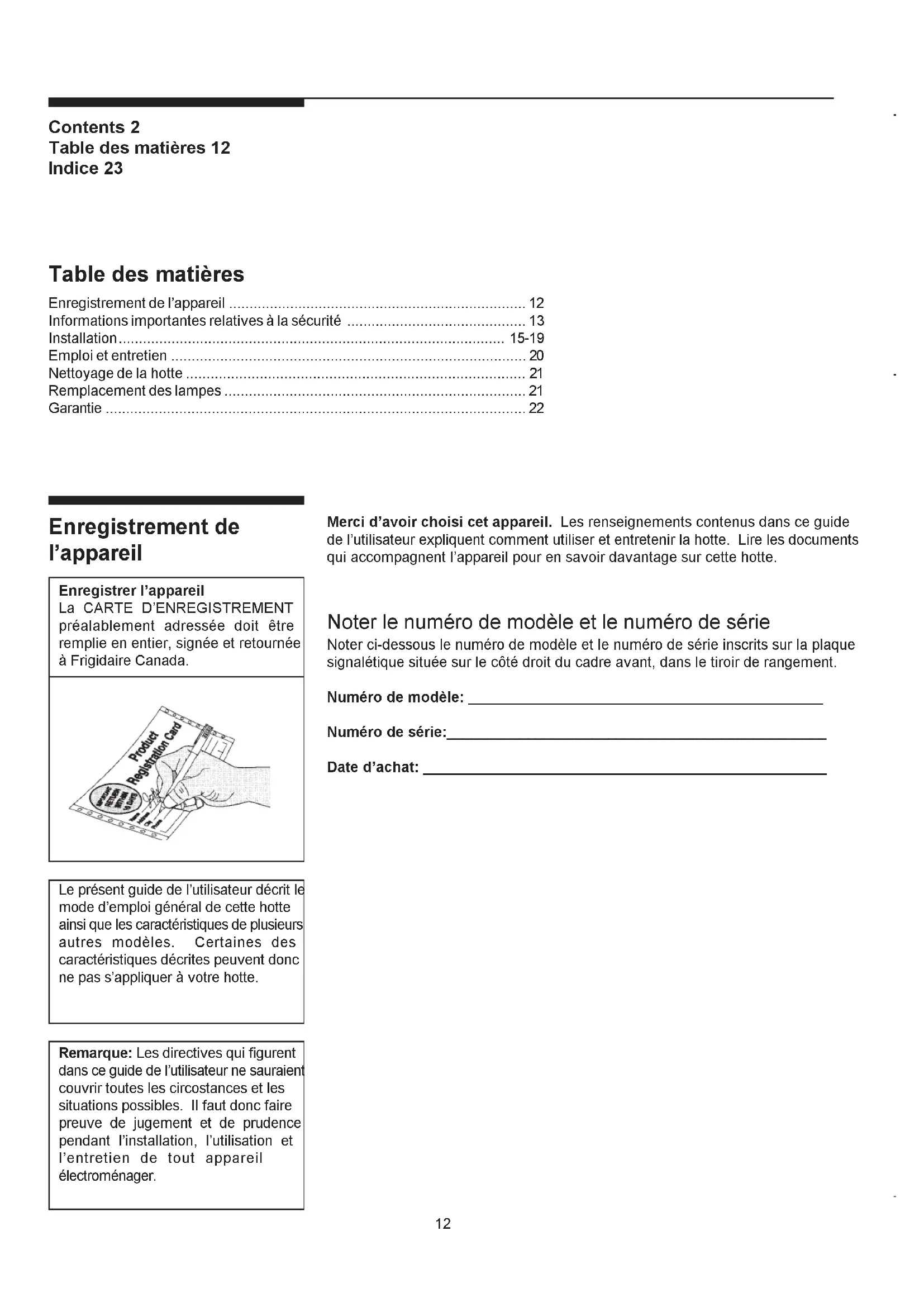 - Hood Cleaning NOTE: Turn blower and lights off. Make sure the lights are cool. If new lights do not operate be sure lights are inserted correctly before calling service. Remove the light cover using a little flat screwdriver or similar tool as a lever. Remove the damaged light and replace with a new 12 Volt, 20 Watt (maximum) halogen light made for a G-4 base. Follow package directions and do not touch new light with bare hands. Reinstall the light cover (snap into position). Lights replacement Figure 15 Figure 16 Light Light cover Turn off electric power to hood before removing light cover.1112 Enregistrement de lappareil Enregistrer lappareil La CARTE DENREGISTREMENT préalablement adressée doit être remplie en entier, signée et retournée à Frigidaire Canada. Le présent guide de lutilisateur décrit le mode demploi général de cette hotte ainsi que les caractéristiques de plusieurs autres modèles. Certaines des caractéristiques décrites peuvent donc ne pas sappliquer à votre hotte. Remarque: Les directives qui figurent dans ce guide de lutilisateur ne sauraient couvrir toutes les circostances et les situations possibles. Il faut donc faire preuve de jugement et de prudence pendant linstallation, lutilisation et lentretien de tout appareil électroménager. Merci davoir choisi cet appareil. Les renseignements contenus dans ce guide de lutilisateur expliquent comment utiliser et entretenir la hotte. Lire les documents qui accompagnent lappareil pour en savoir davantage sur cette hotte. Noter le numéro de modèle et le numéro de série Noter ci-dessous le numéro de modèle et le numéro de série inscrits sur la plaque signalétique située sur le côté droit du cadre avant, dans le tiroir de rangement. Numéro de modèle: ____________________________________________ Numéro de série:_______________________________________________ Date dachat: __________________________________________________ Contents 2 Table des matières 12 Indice 23 Table des matières Enregistrement de lappareil p. 12