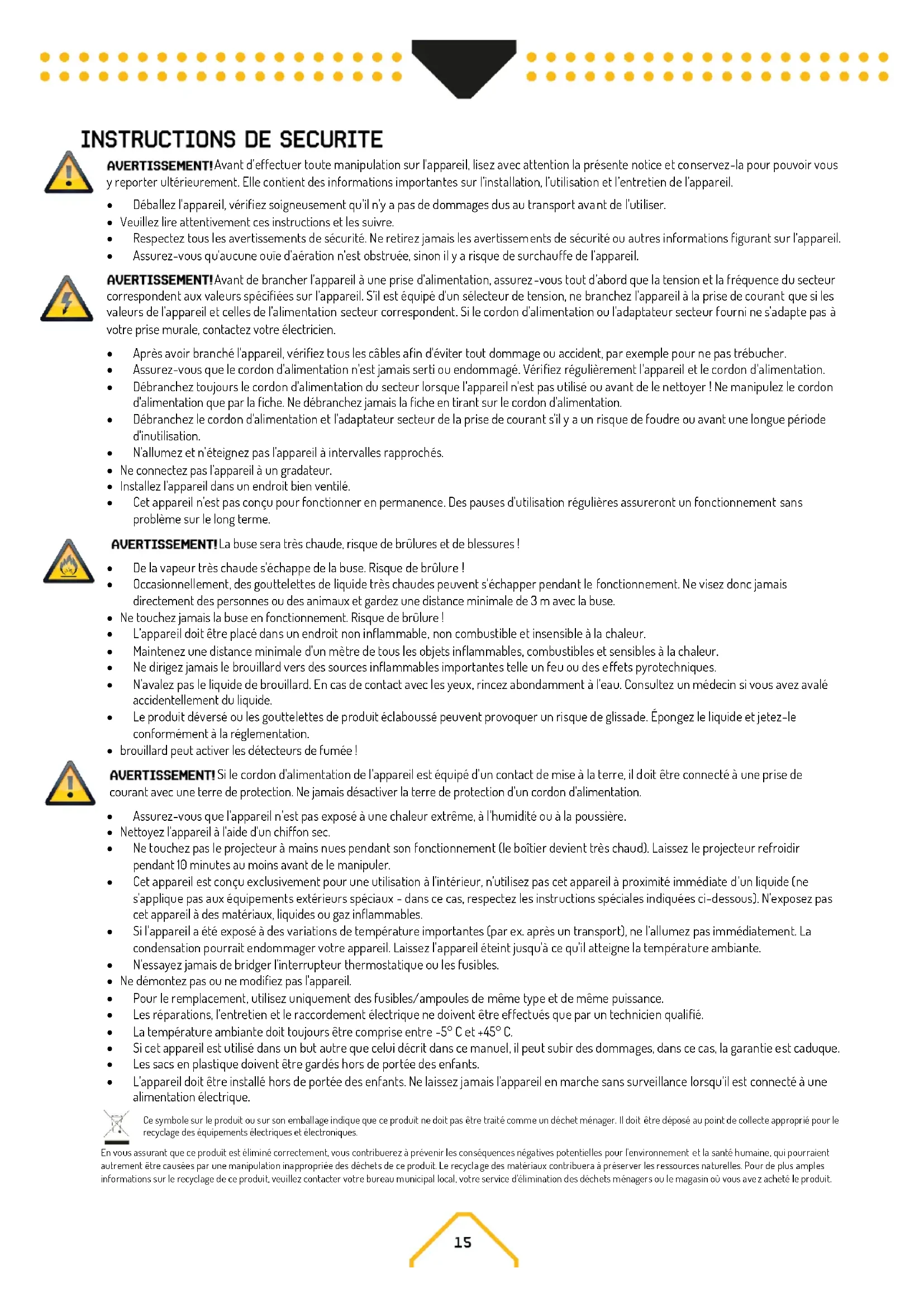 - Ne dirigez jamais le brouillard vers des sources inflammables importantes telle un feu ou des effets pyrotechniques.