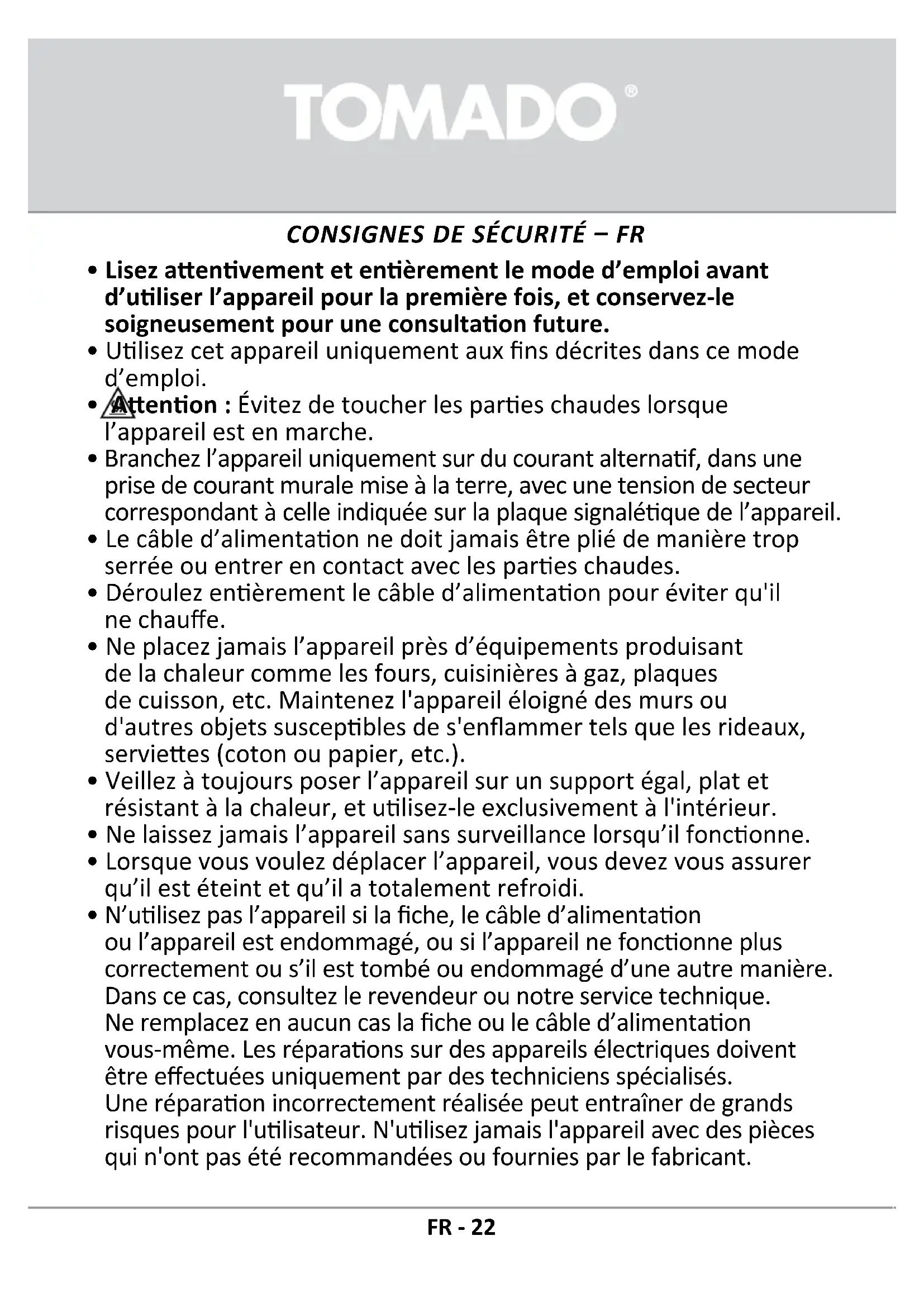 Ce produit est garan pour une période de 24 mois. Votre garane est valable lorsque le produit est ulisé conformément au mode d’emploi et pour l’usage auquel il est desné. Par ailleurs, la preuve d’achat originale doit être fournie, en portant menon de la date d’achat, du nom du détaillant ainsi que du numéro d’arcle du produit. Pour connaître les condions de garane détaillées, rendez-vous sur notre site Internet : www.tomado.com/support
