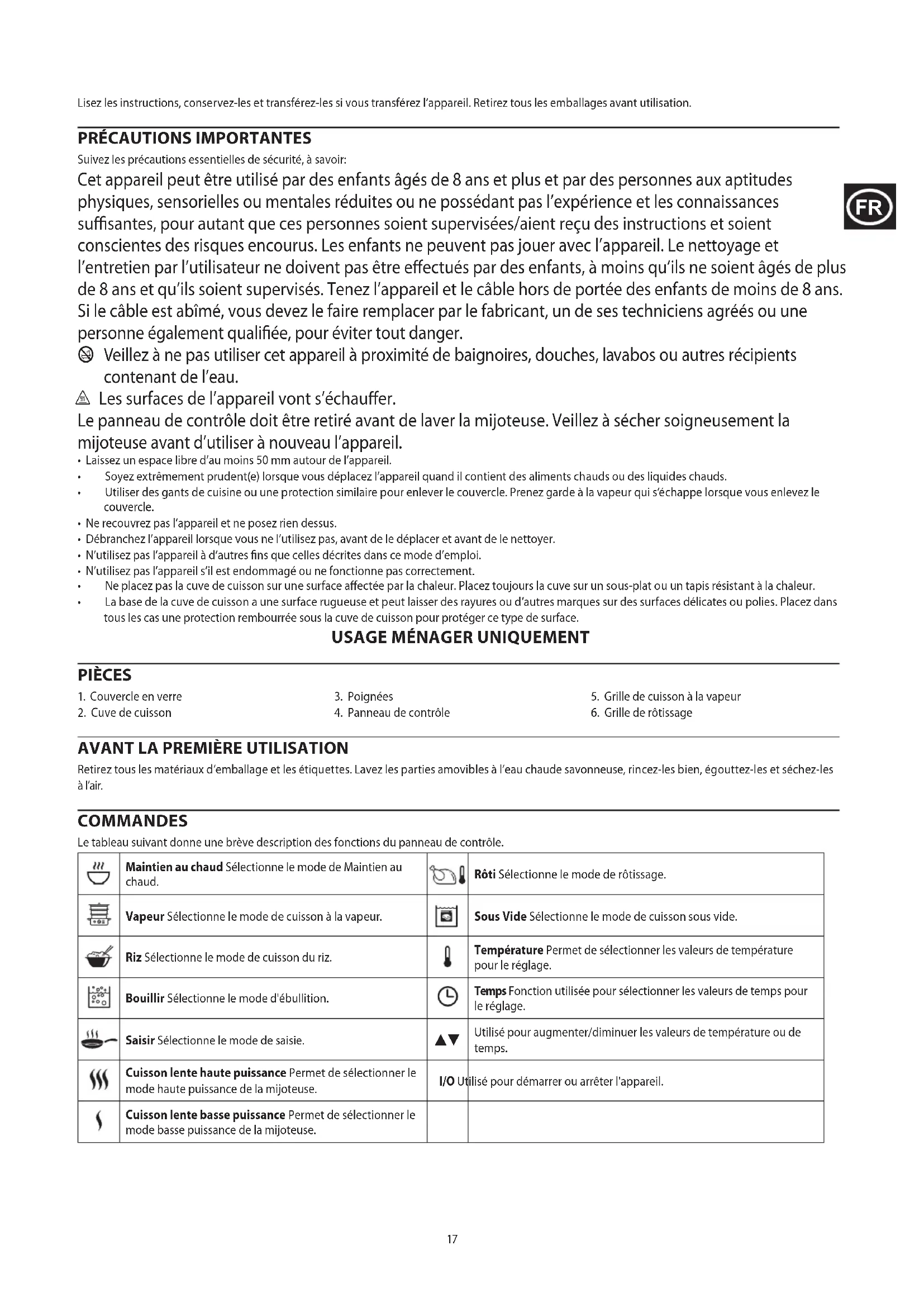 Suivez les précautions essentielles de sécurité, à savoir: Cet appareil peut être utilisé par des enfants âgés de 8 ans et plus et par des personnes aux aptitudes physiques, sensorielles ou mentales réduites ou ne possédant pas l’expérience et les connaissances susantes, pour autant que ces personnes soient supervisées/aient reçu des instructions et soient conscientes des risques encourus. Les enfants ne peuvent pas jouer avec l’appareil. Le nettoyage et l’entretien par l’utilisateur ne doivent pas être eectués par des enfants, à moins qu’ils ne soient âgés de plus de 8 ans et qu’ils soient supervisés. Tenez l’appareil et le câble hors de portée des enfants de moins de 8 ans. Si le câble est abîmé, vous devez le faire remplacer par le fabricant, un de ses techniciens agréés ou une personne également qualiée, pour éviter tout danger. b Veillez à ne pas utiliser cet appareil à proximité de baignoires, douches, lavabos ou autres récipients contenant de l’eau. ¬ Les surfaces de l’appareil vont s’échauer. Le panneau de contrôle doit être retiré avant de laver la mijoteuse. Veillez à sécher soigneusement la mijoteuse avant d’utiliser à nouveau l’appareil.