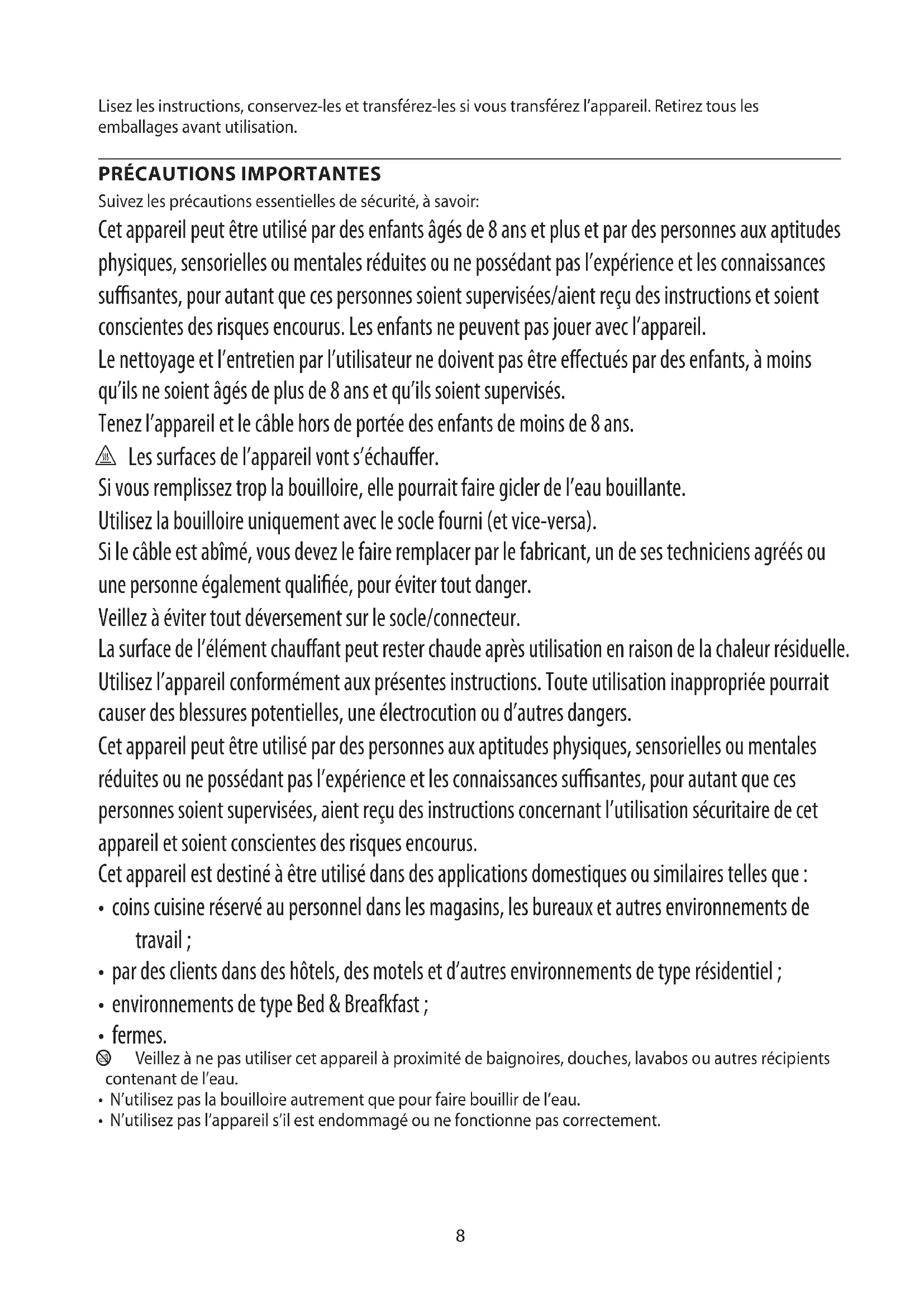 Suivez les précautions essentielles de sécurité, à savoir: Cet appareil peut être utilisé par des enfants âgés de 8 ans et plus et par des personnes aux aptitudes physiques, sensorielles ou mentales réduites ou ne possédant pas l’expérience et les connaissances susantes, pour autant que ces personnes soient supervisées/aient reçu des instructions et soient conscientes des risques encourus. Les enfants ne peuvent pas jouer avec l’appareil. Le nettoyage et l’entretien par l’utilisateur ne doivent pas être eectués par des enfants, à moins qu’ils ne soient âgés de plus de 8 ans et qu’ils soient supervisés. Tenez l’appareil et le câble hors de portée des enfants de moins de 8 ans. h Les surfaces de l’appareil vont s’échauer. Si vous remplissez trop la bouilloire, elle pourrait faire gicler de l’eau bouillante. Utilisez la bouilloire uniquement avec le socle fourni (et vice-versa). Si le câble est abîmé, vous devez le faire remplacer par le fabricant, un de ses techniciens agréés ou une personne également qualiée, pour éviter tout danger. Veillez à éviter tout déversement sur le socle/connecteur. La surface de l’élément chauant peut rester chaude après utilisation en raison de la chaleur résiduelle. Utilisez l’appareil conformément aux présentes instructions. Toute utilisation inappropriée pourrait causer des blessures potentielles, une électrocution ou d’autres dangers. Cet appareil peut être utilisé par des personnes aux aptitudes physiques, sensorielles ou mentales réduites ou ne possédant pas l’expérience et les connaissances susantes, pour autant que ces personnes soient supervisées, aient reçu des instructions concernant l’utilisation sécuritaire de cet appareil et soient conscientes des risques encourus. Cet appareil est destiné à être utilisé dans des applications domestiques ou similaires telles que :
