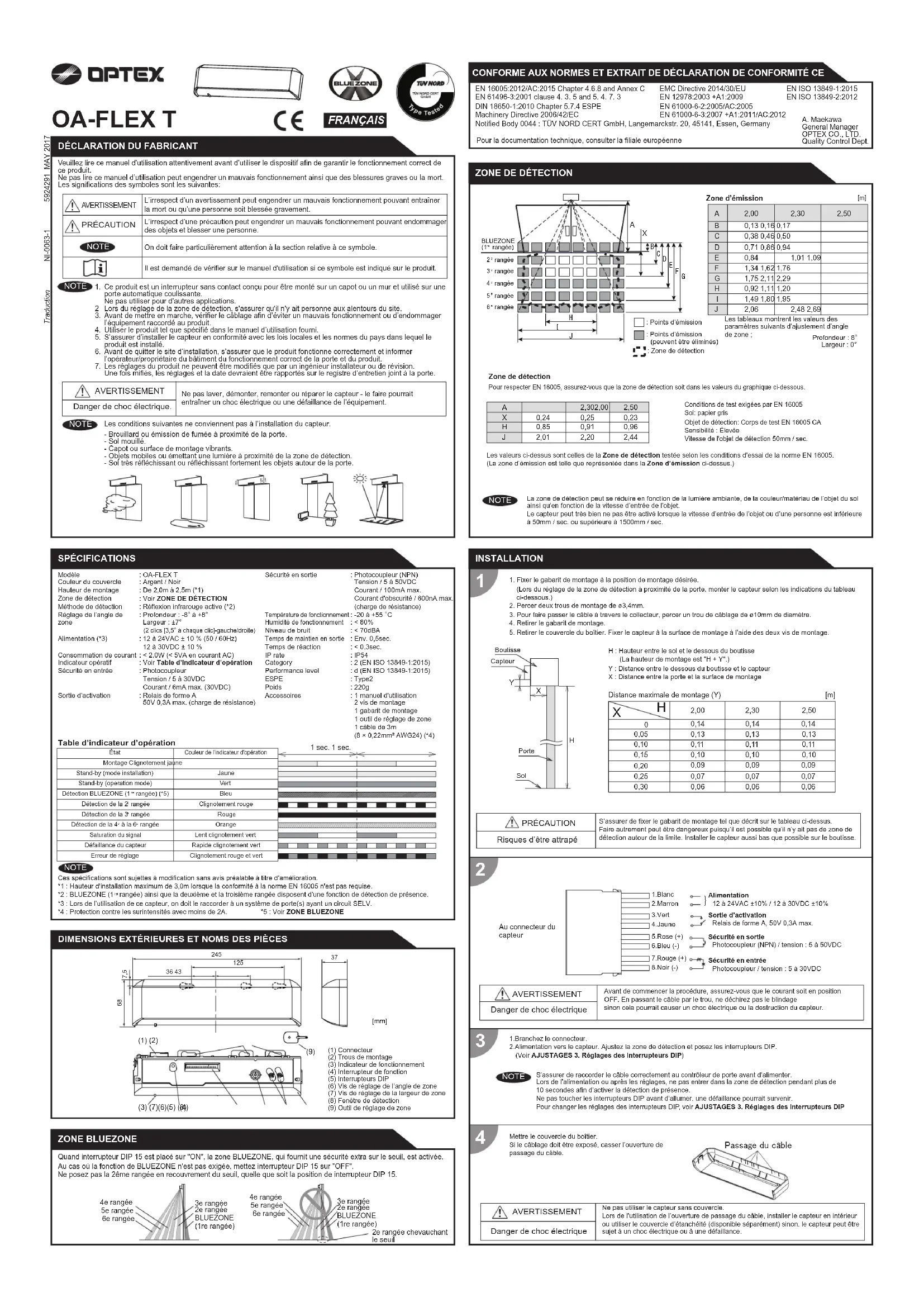 Il est demandé de vérifier sur le manuel d'utilisation si ce symbole est indiqué sur le produit. AVERTISSEMENT PRÉCAUTION NOTE L’irrespect d’un avertissement peut engendrer un mauvais fonctionnement pouvant entraînerla mort ou qu’une personne soit blessée gravement.On doit faire particulièrement attention à la section relative à ce symbole.L’irrespect d’une précaution peut engendrer un mauvais fonctionnement pouvant endommager des objets et blesser une personne.- Brouillard ou émission de fumée à proximité de la porte.- Sol mouillé.- Capot ou surface de montage vibrants. - Objets mobiles ou émettant une lumière à proximité de la zone de détection.- Sol très réfléchissant ou réfléchissant fortement les objets autour de la porte.Les conditions suivantes ne conviennent pas à l’installation du capteur. NOTE FRANÇAIS OA-FLEX T Traduction5924291 MAY 2017NI-0063-1 SPÉCIFICATIONS Table d’indicateur d’opération Stand-by (mode installation)Montage Clignotement jauneCouleur de l’indicateur d'opération État Stand-by (operation mode)Détection BLUEZONE (1 rangée) (*5)Détection de la 2 rangéeDétection de la 3 rangéeDétection de la 4 à la 6 rangéeJauneErreur de réglageDéfaillance du capteurClignotement rouge et vertRapide clignotement vertSaturation du signalLent clignotement vertOrangeRougeClignotement rouge Bleu Vert 1 sec. 1 sec. NOTE INSTALLATION 1. Fixer le gabarit de montage à la position de montage désirée.(Lors du réglage de la zone de détection à proximité de la porte, monter le capteur selon les indications du tableau ci-dessous.)2. Percer deux trous de montage de ø3,4mm.3. Pour faire passer le câble à travers le collecteur, percer un trou de câblage de ø10mm de diamètre.4. Retirer le gabarit de montage.5. Retirer le couvercle du boîtier. Fixer le capteur à la surface de montage à l’aide des deux vis de montage.Au connecteur du capteurSortie d’activationRelais de forme A, 50V 0,3A max.3.Vert 2.Marron1.Blanc4.Jaune5.Rose (+)6.Bleu (-)7.Rouge (+)8.Noir (-)Alimentation12 à 24VAC ±10% / 12 à 30VDC ±10%Sécurité en sortiePhotocoupleur (NPN) / tension : 5 à 50VDCSécurité en entréePhotocoupleur / tension : 5 à 30VDC Danger de choc électrique AVERTISSEMENT Avant de commencer la procédure, assurez-vous que le courant soit en position OFF. En passant le câble par le trou, ne déchirez pas le blindagesinon cela pourrait causer un choc électrique ou la destruction du capteur.1.Branchez le connecteur.2.Alimentation vers le capteur. Ajustez la zone de détection et posez les interrupteurs DIP.(Voir AJUSTAGES 3. Réglages des interrupteurs DIP)S’assurer de raccorder le câble correctement au contrôleur de porte avant d’alimenter.Lors de l’alimentation ou après les réglages, ne pas entrer dans la zone de détection pendant plus de 10 secondes afin d’activer la détection de présence.Ne pas toucher les interrupteurs DIP avant d’allumer, une défaillance pourrait survenir. Pour changer les réglages des interrupteurs DIP, voir AJUSTAGES 3. Réglages des interrupteurs DIP Mettre le couvercle du boîtier.Si le câblage doit être exposé, casser l’ouverture de passage du câble. Passage du câble AVERTISSEMENT Danger de choc électrique Ne pas utiliser le capteur sans couvercle.Lors de l’utilisation de l’ouverture de passage du câble, installer le capteur en intérieur ou utiliser le couvercle d’étanchéité (disponible séparément) sinon, le capteur peut être sujet à un choc électrique ou à une défaillance. NOTE CapteurBoutissePorte Sol