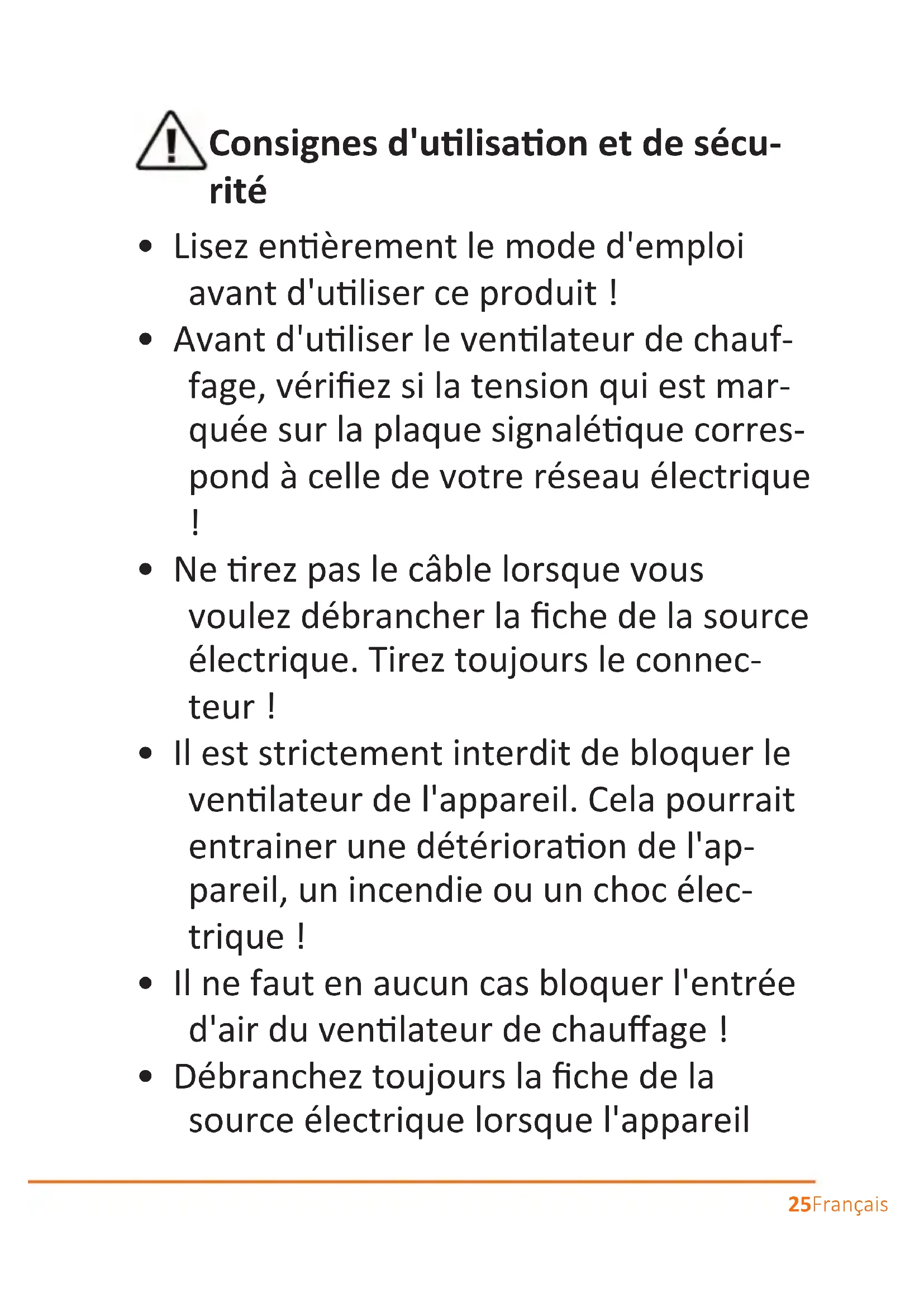 - Avant d'uliser le venlateur de chauf- fage, vériez si la tension qui est mar- quée sur la plaque signaléque corres- pond à celle de votre réseau électrique