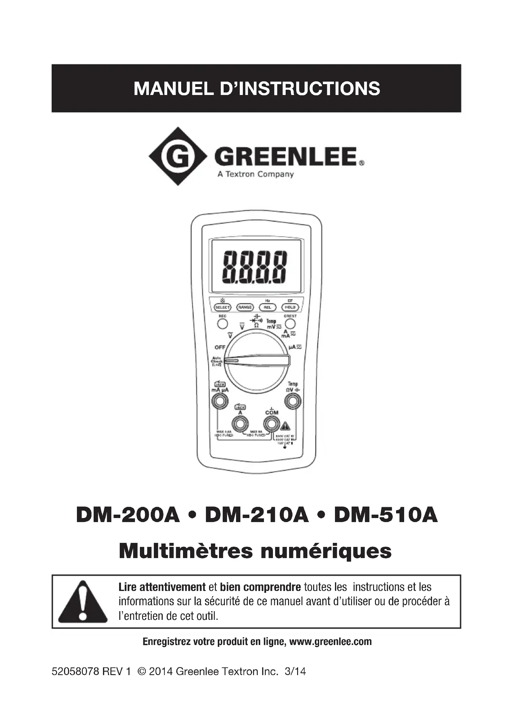 Cleaning Periodically wipe the case with a damp cloth and mild detergent; do not use abrasives or solvents.24 Lifetime Limited Warranty Greenlee Textron Inc. warrants to the original purchaser of these goods for use that these products will be free from defects in workmanship and material for their useful life, excepting normal wear and abuse. This warranty is subject to the same terms and conditions contained in Greenlee Textron Inc.’s standard one-year limited warranty. For all Test Instrument repairs, contact Customer Service at +1-815-397-7070 and request a Return Authorization. For items not covered under warranty (such as items dropped, abused, etc.), a repair cost quote is available upon request. Note: Prior to returning any test instrument, please check replaceable batteries or make sure the battery is at full charge.MANUEL D’INSTRUCTIONS Lire attentivement et bien comprendre toutes les instructions et les informations sur la sécurité de ce manuel avant d’utiliser ou de procéder à l’entretien de cet outil. Enregistrez votre produit en ligne, www.greenlee.com DM-200A • DM-210A • DM-510A Multimètres numériques 52058078 REV 1 © 2014 Greenlee Textron Inc. 3/1426 Description Les multimètres numériques DM-200A, DM-210A et DM-510A de Greenlee sont des appareils de contrôle portables offrant les capacités de mesure suivantes: tension c.a. et c.c., intensité c.a. et c.c., fréquence et résistance. Ils permettent également la vérification de diodes et les contrôles de continuité. Une interface informatique à isolation optique avec logiciel, proposée en option, permet l’enregistrement des mesures de l’appareil sur un ordinateur. Les autres fonctions et capacités spéciales communes à tous les modèles comprennent: