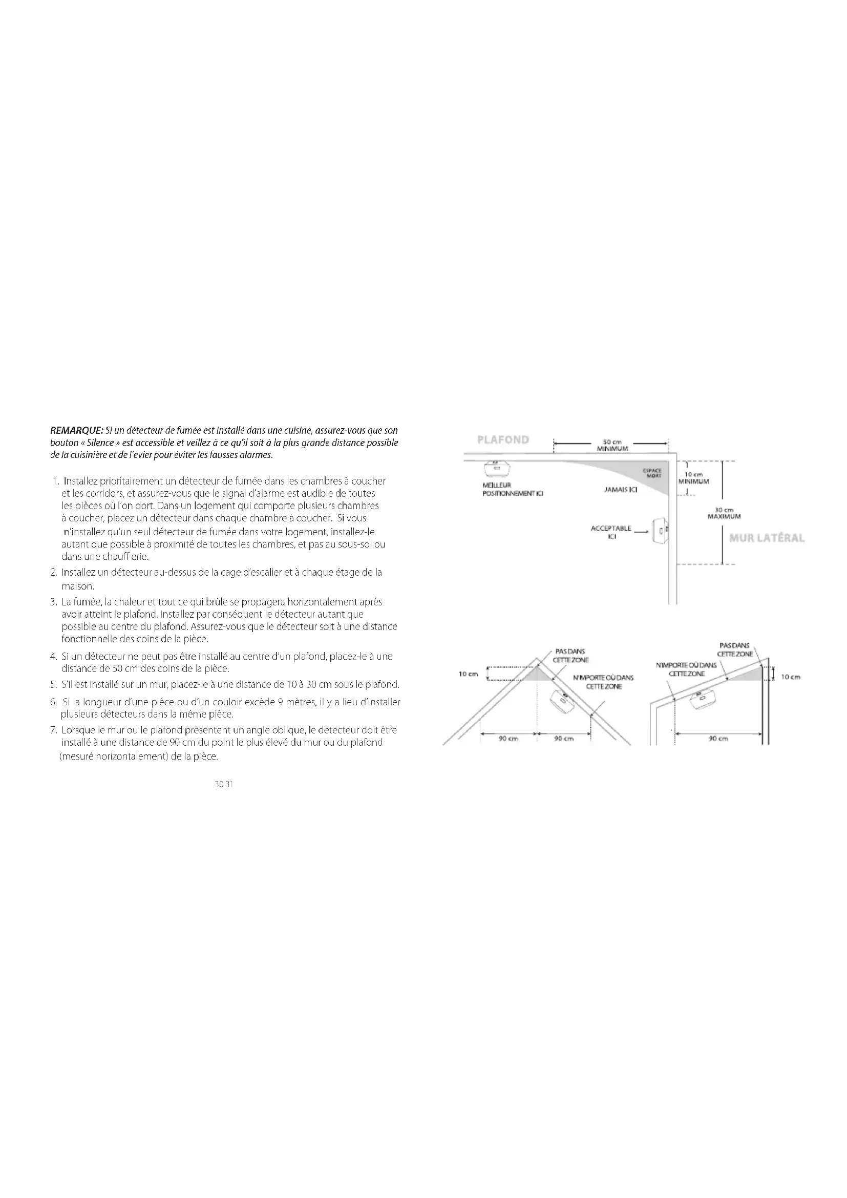 DÉTECTEUR NE FONCTIONNAIT PAS CORRECTEMENT, REMPLACEZ-LE IMMÉDIATEMENT! EN EFFET, S’IL NE FONCTIONNE PAS CORRECTEMENT, IL NE VOUS ALERTERA PAS EN CAS DE PROBLÈME. Positionnement30 31 REMARQUE: Si un détecteur de fumée est installé dans une cuisine, assurez-vous que son bouton «Silence» est accessible et veillez à ce qu’il soit à la plus grande distance possible de la cuisinière et de l’évier pour éviter les fausses alarmes.