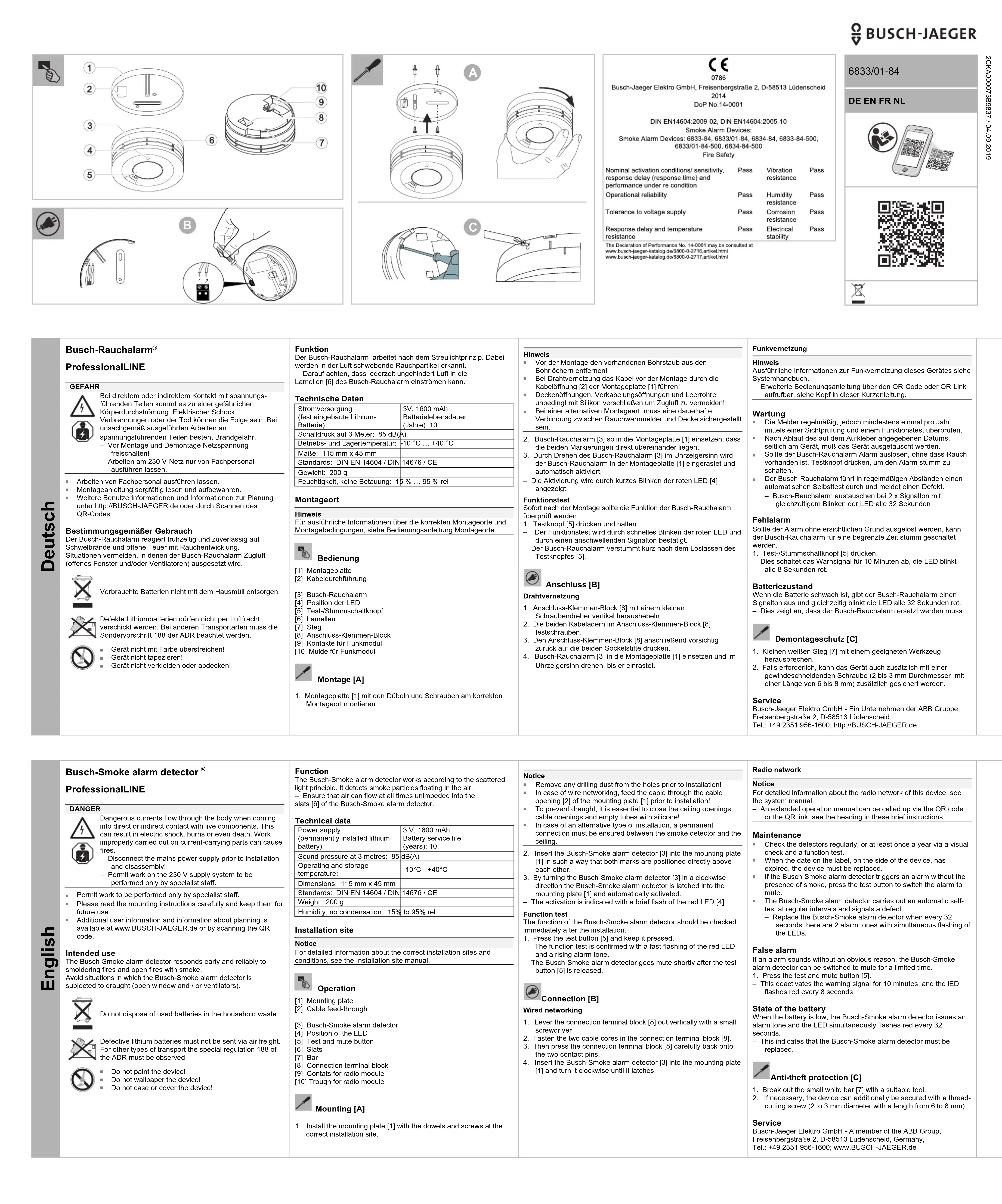 Confier toute intervention uniquement à du personnel spécialisé. Les instructions de montage sont à lire attentivement et à conserver. Des informations utilisateur supplémentaires et des informations de planification sont disponibles sur le site www.BUSCH-JAEGER.de ou en scannant le code QR. Utilisation conforme Le Busch-détecteur de fumée réagit tôt et fiablement aux carbonisations à basse température et aux feux nus. Eviter les situations exposant le Busch-détecteur de fumée à un courant d'air (fenêtre ouverte et/ou ventilateurs).