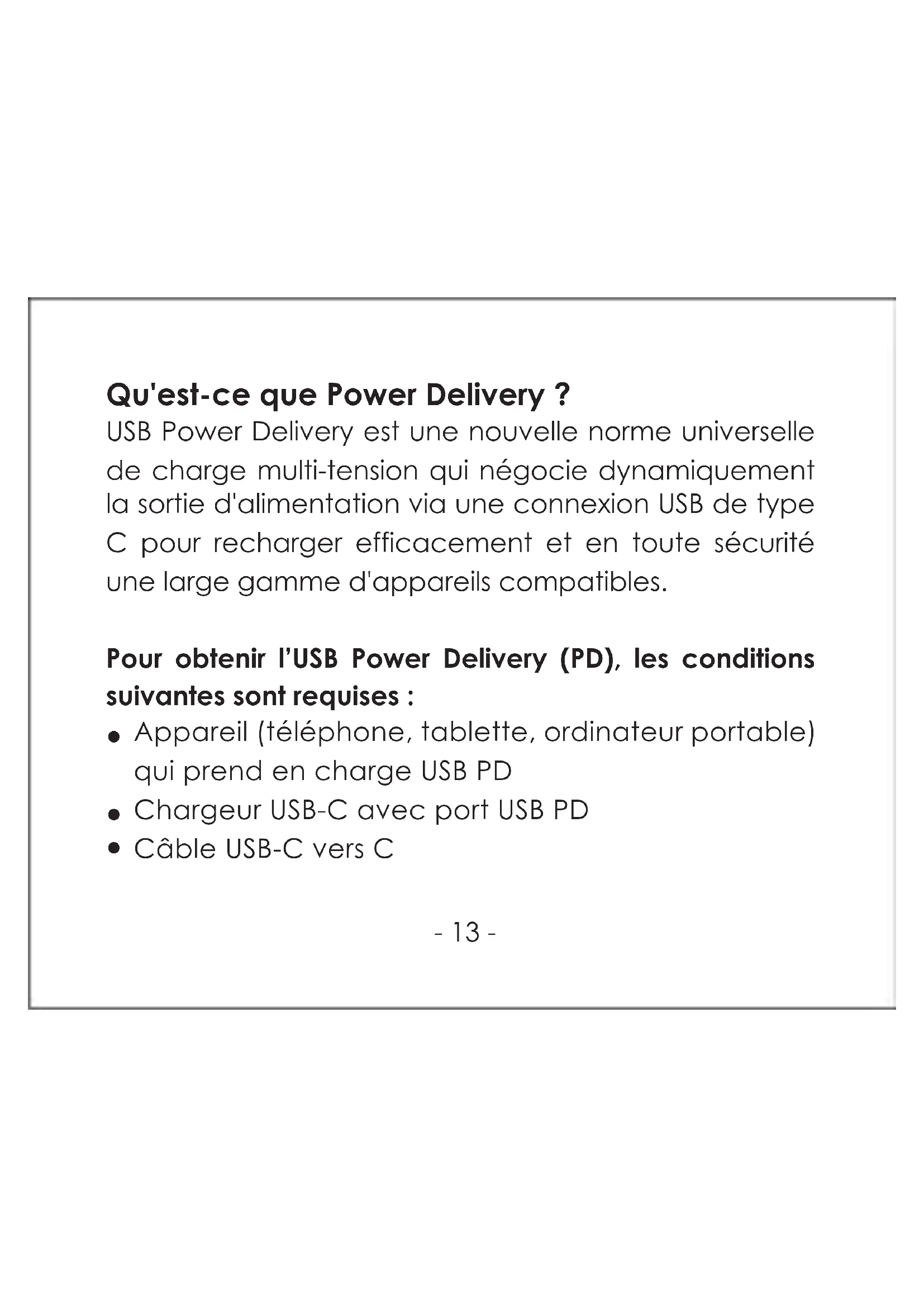 Caractéristiques- 13 - Qu'est-ce que Power Delivery? USB Power Delivery est une nouvelle norme universelle de charge multi-tension qui négocie dynamiquement la sortie d'alimentation via une connexion USB de type C pour recharger efficacement et en toute sécurité une large gamme d'appareils compatibles. Pour obtenir l’USB Power Delivery (PD), les conditions suivantes sont requises: Appareil (téléphone, tablette, ordinateur portable) qui prend en charge USB PD Chargeur USB-C avec port USB PD Câble USB-C vers C