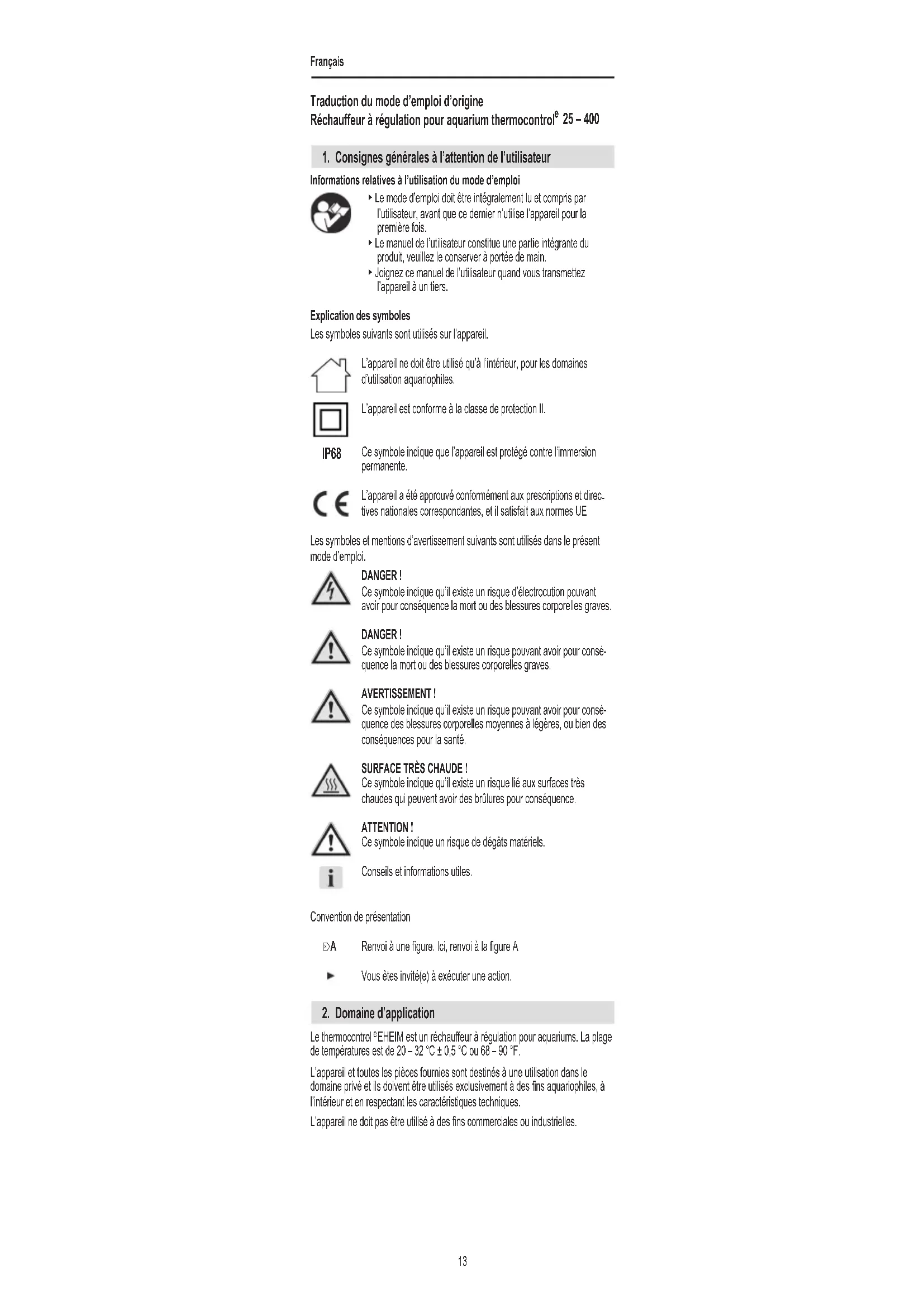 EHEIM est un réchaueur à régulation pour aquariums. La plage de températures est de 20 – 32 °C ± 0,5 °C ou 68 – 90 °F. L’appareil et toutes les pièces fournies sont destinés à une utilisation dans le domaine privé et ils doivent être utilisés exclusivement à des ns aquariophiles, à l’intérieur et en respectant les caractéristiques techniques. L’appareil ne doit pas être utilisé à des ns commerciales ou industrielles. IP68 ⌦AFrançais