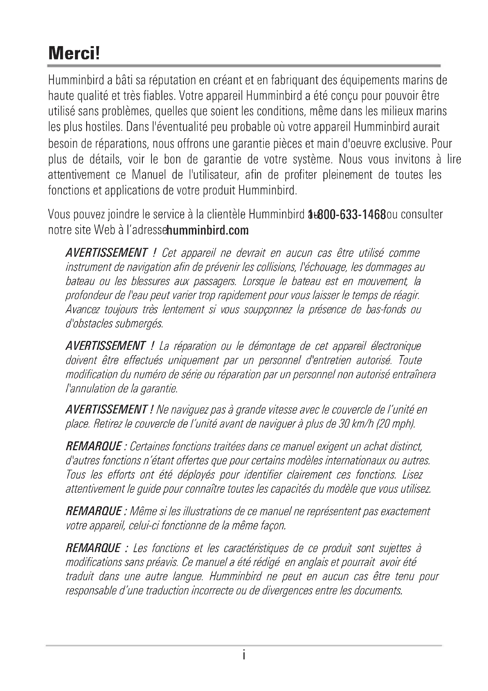 AVERTISSEMENT ! Cet appareil ne devrait en aucun cas être utilisé comme instrument de navigation afin de prévenir les collisions, l'échouage, les dommages au bateau ou les blessures aux passagers. Lorsque le bateau est en mouvement, la profondeur de l'eau peut varier trop rapidement pour vous laisser le temps de réagir. Avancez toujours très lentement si vous soupçonnez la présence de bas-fonds ou d'obstacles submergés. AVERTISSEMENT ! La réparation ou le démontage de cet appareil électronique doivent être effectués uniquement par un personnel d'entretien autorisé. Toute modification du numéro de série ou réparation par un personnel non autorisé entraînera l'annulation de la garantie. AVERTISSEMENT ! Ne naviguez pas à grande vitesse avec le couvercle de l’unité en place. Retirez le couvercle de l’unité avant de naviguer à plus de 30 km/h (20 mph). REMARQUE : Certaines fonctions traitées dans ce manuel exigent un achat distinct, d'autres fonctions n’étant offertes que pour certains modèles internationaux ou autres. Tous les efforts ont été déployés pour identifier clairement ces fonctions. Lisez attentivement le guide pour connaître toutes les capacités du modèle que vous utilisez. REMARQUE : Même si les illustrations de ce manuel ne représentent pas exactement votre appareil, celui-ci fonctionne de la même façon. REMARQUE : Les fonctions et les caractéristiques de ce produit sont sujettes à modifications sans préavis. Ce manuel a été rédigé en anglais et pourrait avoir été traduit dans une autre langue. Humminbird ne peut en aucun cas être tenu pour responsable d’une traduction incorrecte ou de divergences entre les documents.