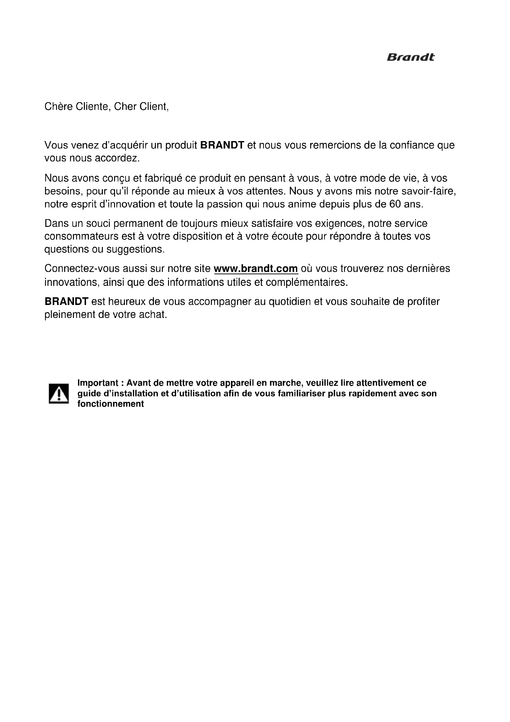 Consulter notre site : www.brandt.fr Nous écrire à l’adresse postale suivante : Service Consommateurs BRANDT 5 Avenue des Béthunes