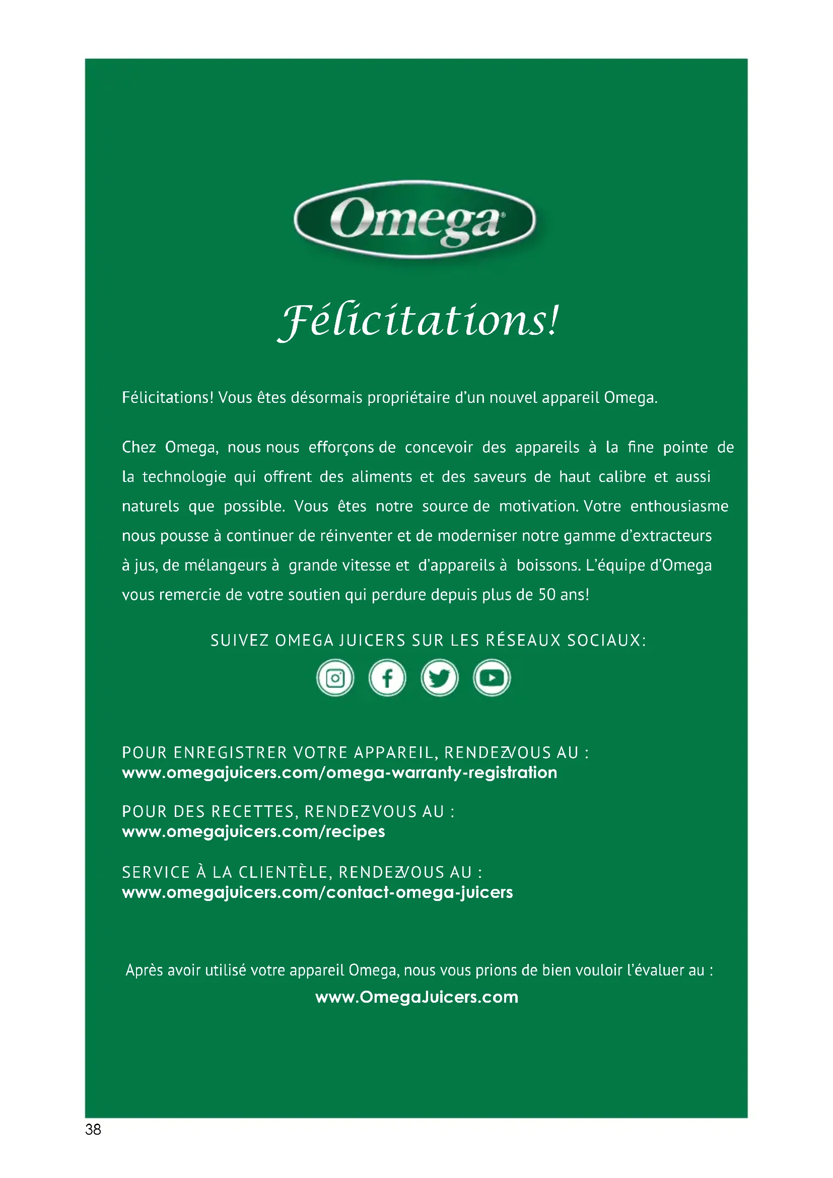 Félicitations! Félicitations! Vous êtes désormais propriétaire d’un nouvel appareil Omega. Chez Omega, nous nous efforçons de concevoir des appareils à la ne pointe de la technologie qui offrent des aliments et des saveurs de haut calibre et aussi naturels que possible. Vous êtes notre source de motivation. Votre enthousiasme nous pousse à continuer de réinventer et de moderniser notre gamme d’extracteurs à jus, de mélangeurs à grande vitesse et d’appareils à boissons. L’équipe d’Omega vous remercie de votre soutien qui perdure depuis plus de 50 ans!