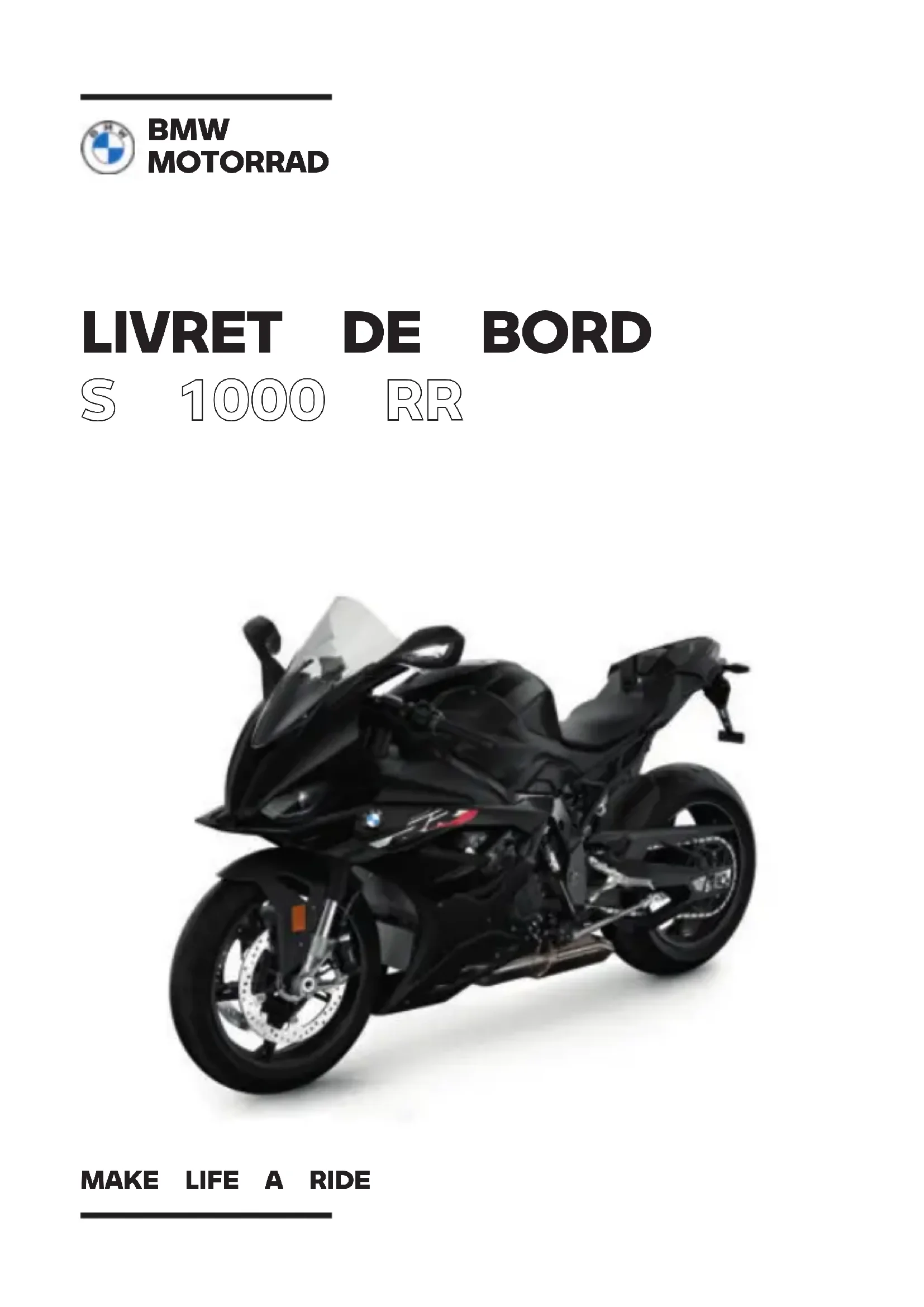 S 1000 RR BMW MOTORRAD MAKE LIFE A RIDEDonnées de la moto Modèle Numéro d'identification du véhicule Code couleur Première immatriculation N° d'immatriculation Données du concessionnaire Interlocuteur au service après-vente Madame/Monsieur N° de téléphone Adresse du concessionnaire/Téléphone (cachet de la société)VOTRE BMW. Nous vous félicitons d'avoir porté votre choix sur un véhicule de BMW Motorrad et avons le plaisir de vous accueillir dans le cercle des pilotes BMW. Familiarisez-vous avec votre nouveau véhicule afin d'être en mesure de vous déplacer en toute sécurité sur les routes. À propos de ce livret de bord Lisez le livret de bord avant de démarrer votre nouvelle BMW. Vous y trouverez des indications importantes concernant l'utilisa- tion du véhicule qui vous permettront de profiter pleinement des avantages techniques de votre BMW. Vous y trouverez également des informations sur l'entretien et la maintenance de façon à assurer la sécurité de fonctionnement, la sécurité routière et une conservation optimale de la valeur de votre véhicule. Si vous étiez amené à vendre un jour votre BMW, pensez à re- mettre le livret de bord. Il fait partie intégrante de la moto. Nous espérons que votre BMW vous donnera entière satisfaction et vous souhaitons bonne route BMW Motorrad.01
