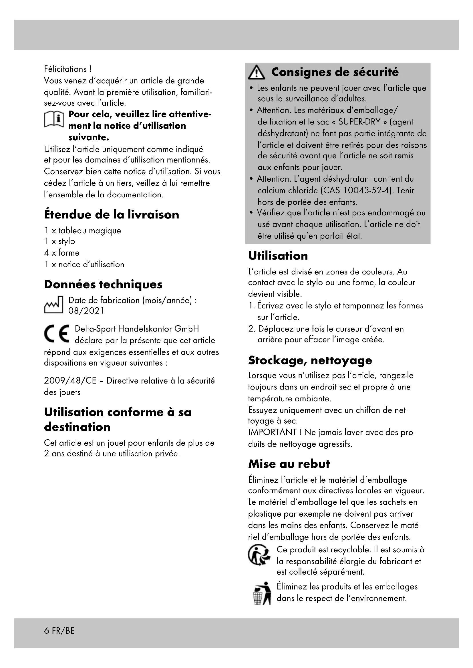 - s‘il présente les qualités qu‘un acheteur peut légitimement attendre eu égard aux déclara- tions publiques faites par le vendeur, par le producteur ou par son représentant, notam- ment dans la publicité ou l‘étiquetage ; FR/BE8 FR/BE 2° Ou s‘il présente les caractéristiques définies d‘un commun accord par les parties ou être propre à tout usage spécial recherché par l‘acheteur, porté à la connaissance du vendeur et que ce dernier a accepté. Article L217-12 du Code de la consommation L‘action résultant du défaut de conformité se prescrit par deux ans à compter de la délivrance du bien. Article 1641 du Code civil Le vendeur est tenu de la garantie à raison des défauts cachés de la chose vendue qui la rendent impropre à l‘usage auquel on la destine, ou qui diminuent tellement cet usage que l‘acheteur ne l‘aurait pas acquise, ou n‘en aurait donné qu‘un moindre prix, s‘il les avait connus. Article 1648 1er alinéa du Code civil L‘action résultant des vices rédhibitoires doit être intentée par l‘acquéreur dans un délai de deux ans à compter de la découverte du vice. Les pièces détachées indispensables à l’utili- sation du produit sont disponibles pendant la durée de la garantie du produit. IAN : 366892_2101 Service France Tel. : 0800 919270 E-Mail : deltasport@lidl.fr Service Belgique Tel. : 070 270 171 (0,15 EUR/Min.) E-Mail : deltasport@lidl.be9 Gefeliciteerd! Met uw aankoop hebt u voor een hoogwaardig artikel gekozen. Zorg ervoor dat u voor het eerste gebruik met het artikel vertrouwd raakt. Lees hiervoor de volgende gebruiksaanwijzing zorgvuldig door. Gebruik het artikel alleen zoals omschreven en voor het aangegeven doel. Bewaar deze ge- bruiksaanwijzing goed. Geef alle documenten mee als u het artikel aan iemand anders geeft. Leveringsomvang 1 x toverbord 1 x pen 4 x vorm 1 x gebruiksaanwijzing Technische gegevens Productiedatum (maand/jaar): 08/2021 Hierbij verklaart Delta-Sport Handelskontor GmbH dat dit artikel voldoet aan de volgende basiseisen en de overige ter zake doende bepalingen: 2009/48/EG – Speelgoedrichtlijn Beoogd gebruik Dit artikel is speelgoed voor kinderen vanaf 2 jaar oud voor particulier gebruik. Veiligheidstips