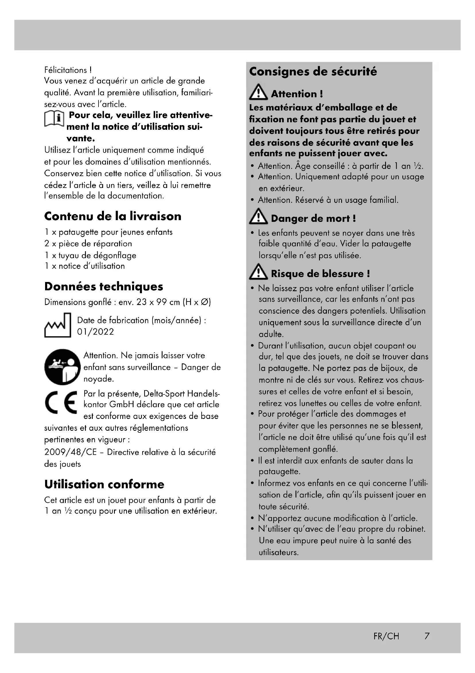 positionnez-la sur la zone endommagée et pressez fermement dessus. Stockage, nettoyage Changez régulièrement l’eau de l’article, en par- ticulier par temps de canicule et lorsque l’eau est sale ! Lorsque vous n’utilisez pas l’article, rangez-le toujours non gonflé, sec, propre et à une température ambiante. Les valves doivent toujours être fermées pendant le stockage. Ne nettoyer qu’avec de l’eau ou de l’eau savon- neuse, jamais avec des produits de nettoyage agressifs. Lors du stockage hivernal, ne placer aucun objet pointu sur le produit et ne pas pulvériser de talc. Mise au rebut Éliminez l‘article et le matériel d‘emballage conformément aux directives locales en vigueur. Le matériel d‘emballage tel que les sachets en plastique par exemple ne doivent pas arriver dans les mains des enfants. Conservez le maté- riel d‘emballage hors de portée des enfants. Ce produit est recyclable. Il est soumis à la responsabilité élargie du fabricant et est collecté séparément. Éliminez les produits et les emballages dans le respect de l‘environnement. Le code de recyclage est utilisé pour identifier les différents matériaux pour le retour dans le circuit de recyclage. Le code se compose du symbole de recyclage, qui doit correspondre au circuit de recyclage, et d‘un numéro identifiant le matériau.10 Indications concernant la garantie et le service après- vente L’article a été produit avec grand soin et sous un contrôle constant. DELTA-SPORT HANDELS- KONTOR GmbH accorde au client final privé une garantie de trois ans sur cet article à comp- ter de la date d’achat (période de garantie) conformément aux dispositions suivantes. La garantie ne vaut que pour les défauts de maté- riaux et de fabrication. La garantie ne couvre pas les pièces soumises à une usure normale, lesquelles doivent donc être considérées comme des pièces d’usure (comme par ex. les piles), de même qu’elle ne couvre pas les pièces fragiles, telles que les interrupteurs, les batteries ou les pièces fabriquées en verre. Les réclamations au titre de cette garantie sont exclues si l’article a été utilisé de manière abusive ou inappropriée, hors du cadre de son usage ou du champ d’application prévu ou si les instructions de la notice d’utilisation n’ont pas été respectées, à moins que le client final ne prouve que l´article présentait un défaut de matériau ou de fabrication n´étant pas dû à l’une des conditions mentionnées ci-dessus. Les réclamations au titre de la garantie ne peuvent être adressées pendant la période de garantie qu’en présentant le ticket de caisse original. Veuillez pour cela conserver le ticket de caisse original. Ceci s’applique également aux pièces remplacées et réparées. Si vous avez des plaintes à formuler, veuillez d’abord contacter le service d’assistance téléphonique ci-dessous ou nous contacter par courrier électronique. Si le cas est couvert par la garantie, nous nous engageons - à notre appréciation - à réparer ou à remplacer l’article gratuitement pour vous ou à vous rembourser le prix d’achat. Aucun autre droit ne découle de la garantie. Vos droits légaux, en particulier les droits de garantie contre le vendeur concerné, ne sont pas limités par cette garantie. Article L217-16 du Code de la consom- mation Lorsque l‘acheteur demande au vendeur, pendant le cours de la garantie commerciale qui lui a été consentie lors de l‘acquisition ou de la réparation d‘un bien meuble, une remise en état couverte par la garantie, toute période d‘immo- bilisation d‘au moins sept jours vient s‘ajouter à la durée de la garantie qui restait à courir. Cette période court à compter de la demande d‘intervention de l‘acheteur ou de la mise à disposition pour réparation du bien en cause, si cette mise à disposition est postérieure à la demande d‘intervention. Indépendamment de la garantie commerciale souscrite, le vendeur reste tenu des défauts de conformité du bien et des vices rédhibitoires dans les conditions prévues aux articles L217-4 à L217-13 du Code de la consommation et aux articles 1641 à 1648 et 2232 du Code Civil. Article L217-4 du Code de la consomma- tion Le vendeur livre un bien conforme au contrat et répond des défauts de conformité existant lors de la délivrance. Il répond également des défauts de conformité résultant de l‘emballage, des instructions de montage ou de l‘installation lorsque celle-ci a été mise à sa charge par le contrat ou a été réalisée sous sa responsabilité. Article L217-5 du Code de la consomma- tion Le bien est conforme au contrat : 1° S´il est propre à l‘usage habituellement attendu d‘un bien semblable et, le cas échéant :