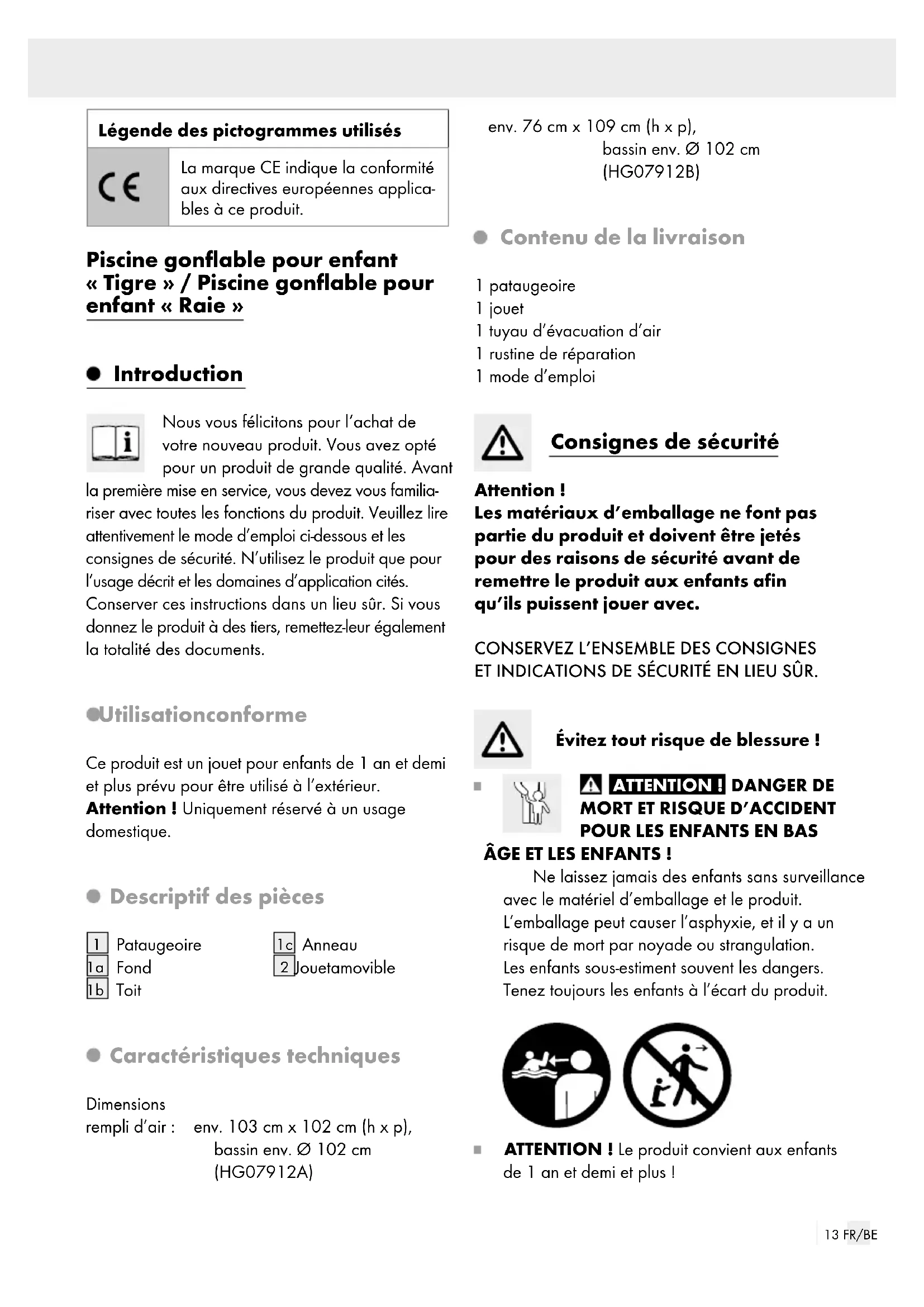 Jouet amovible Caractéristiques techniques Dimensions rempli d’air: env. 103 cm x 102 cm (h x p), bassin env. Ø 102 cm (HG07912A) env. 76 cm x 109 cm (h x p), bassin env. Ø 102 cm (HG07912B) Contenu de la livraison 1 pataugeoire 1 jouet 1 tuyau d’évacuation d’air 1 rustine de réparation 1 mode d’emploi Consignes de sécurité Attention! Les matériaux d’emballage ne font pas partie du produit et doivent être jetés pour des raisons de sécurité avant de remettre le produit aux enfants afin qu’ils puissent jouer avec.