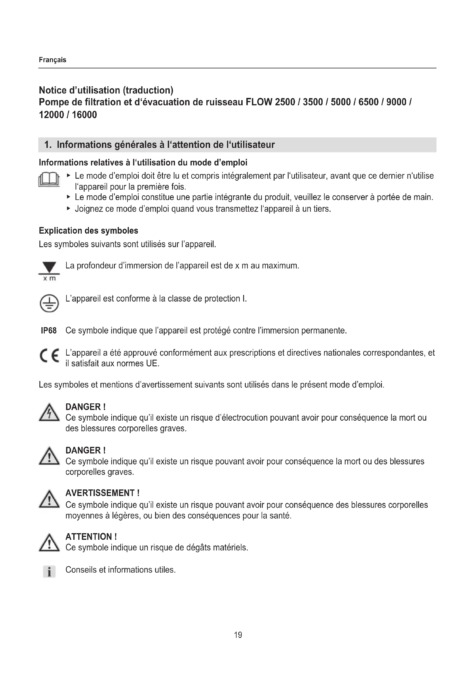 Informations relatives à l‘utilisation du mode d’emploi ▶ Le mode d’emploi doit être lu et compris intégralement par l‘utilisateur, avant que ce dernier n‘utilise l‘appareil pour la première fois. ▶ Le mode d’emploi constitue une partie intégrante du produit, veuillez le conserver à portée de main. ▶ Joignez ce mode d’emploi quand vous transmettez l‘appareil à un tiers. Explication des symboles Les symboles suivants sont utilisés sur l’appareil. La profondeur d’immersion de l’appareil est de x m au maximum. L’appareil est conforme à la classe de protection I. Ce symbole indique que l’appareil est protégé contre l’immersion permanente. L’appareil a été approuvé conformément aux prescriptions et directives nationales correspondantes, et il satisfait aux normes UE. Les symboles et mentions d’avertissement suivants sont utilisés dans le présent mode d’emploi. DANGER ! Ce symbole indique qu’il existe un risque d’électrocution pouvant avoir pour conséquence la mort ou des blessures corporelles graves. DANGER ! Ce symbole indique qu’il existe un risque pouvant avoir pour conséquence la mort ou des blessures corporelles graves. AVERTISSEMENT ! Ce symbole indique qu’il existe un risque pouvant avoir pour conséquence des blessures corporelles moyennes à légères, ou bien des conséquences pour la santé. ATTENTION ! Ce symbole indique un risque de dégâts matériels. Conseils et informations utiles. IP6820 Français Convention de présentation Renvoi à une illustration, ici à la gure A Vous êtes invité(e) à exécuter une action.