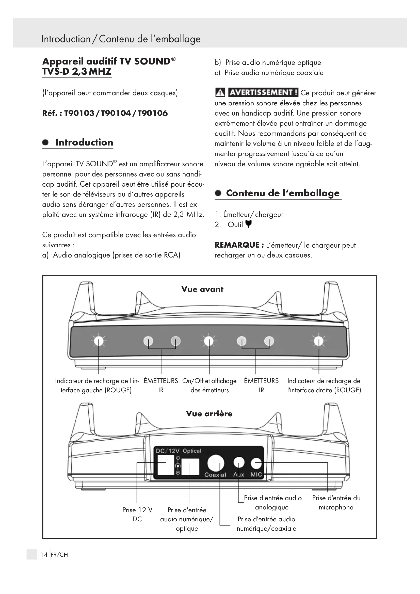 ÉMETTEURS Écouteurs en silicone interchangeables Réglage SON ON / OFF / Réglage volume sonore TV-Sound Modell T90103-T90104-T90106_Content_DE-FR-IT.indd 15 28.08.13 11:1716 FR/CH InstallationContenu de l‘emballage / Précautions à prendre avec la batterie