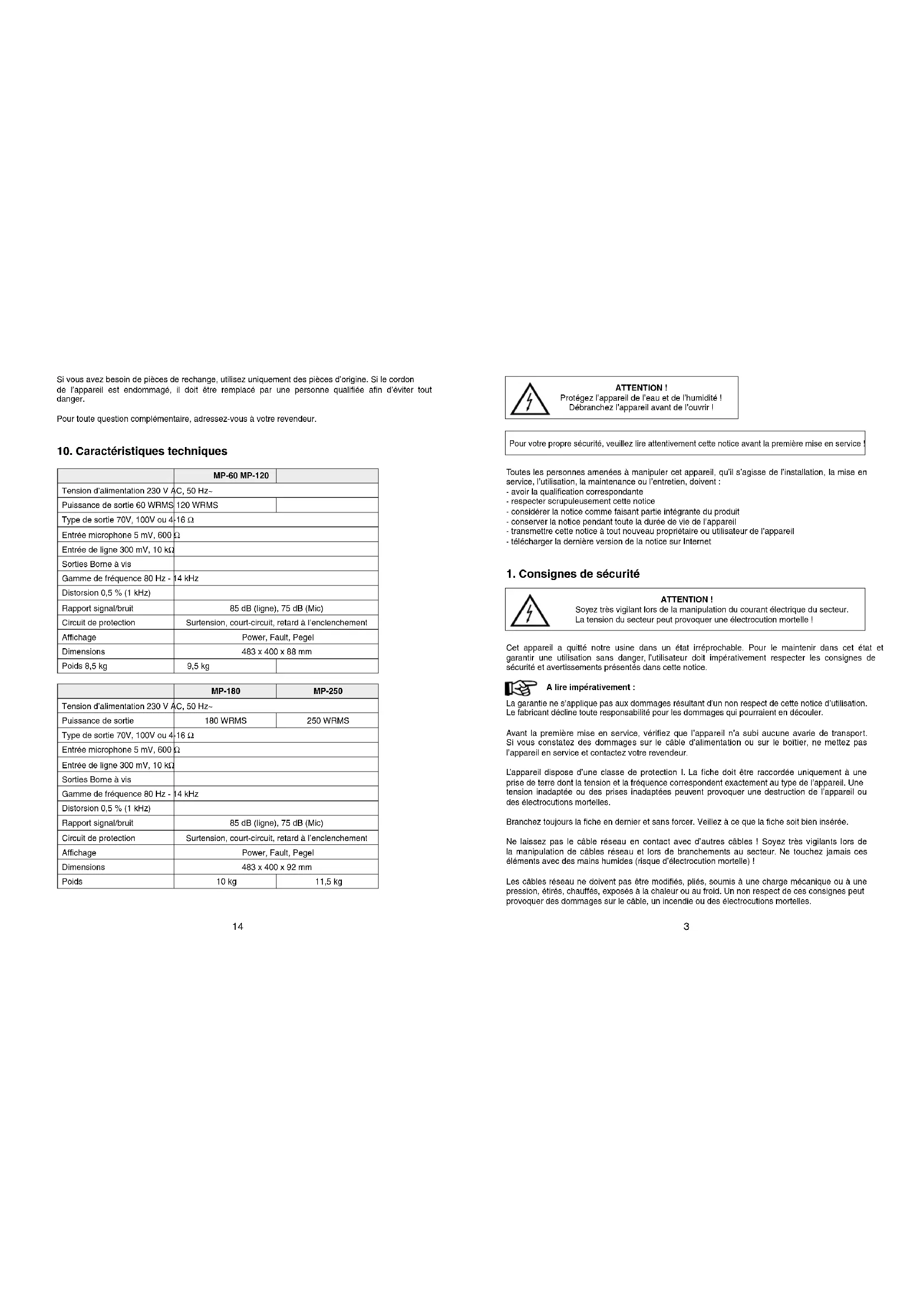 MP-60 MP-120 Tension d’alimentation 230 V AC, 50 Hz~ Puissance de sortie 60 WRMS 120 WRMS Type de sortie 70V, 100V ou 4-16 Ω Entrée microphone 5 mV, 600 Ω Entrée de ligne 300 mV, 10 kΩ Sorties Borne à vis Gamme de fréquence 80 Hz - 14 kHz Distorsion 0,5 % (1 kHz) Rapport signal/bruit 85 dB (ligne), 75 dB (Mic) Circuit de protection Surtension, court-circuit, retard à l’enclenchement Affichage Power, Fault, Pegel Dimensions 483 x 400 x 88 mm Poids 8,5 kg 9,5 kg MP-180 MP-250 Tension d’alimentation 230 V AC, 50 Hz~ Puissance de sortie 180 WRMS 250 WRMS Type de sortie 70V, 100V ou 4-16 Ω Entrée microphone 5 mV, 600 Ω Entrée de ligne 300 mV, 10 kΩ Sorties Borne à vis Gamme de fréquence 80 Hz - 14 kHz Distorsion 0,5 % (1 kHz) Rapport signal/bruit 85 dB (ligne), 75 dB (Mic) Circuit de protection Surtension, court-circuit, retard à l’enclenchement Affichage Power, Fault, Pegel Dimensions 483 x 400 x 92 mm Poids 10 kg 11,5 kg ATTENTION ! Protégez l’appareil de l’eau et de l’humidité ! Débranchez l’appareil avant de l’ouvrir ! Pour votre propre sécurité, veuillez lire attentivement cette notice avant la première mise en service ! Toutes les personnes amenées à manipuler cet appareil, qu’il s’agisse de l’installation, la mise en service, l’utilisation, la maintenance ou l’entretien, doivent : - avoir la qualification correspondante - respecter scrupuleusement cette notice - considérer la notice comme faisant partie intégrante du produit - conserver la notice pendant toute la durée de vie de l’appareil - transmettre cette notice à tout nouveau propriétaire ou utilisateur de l’appareil - télécharger la dernière version de la notice sur Internet