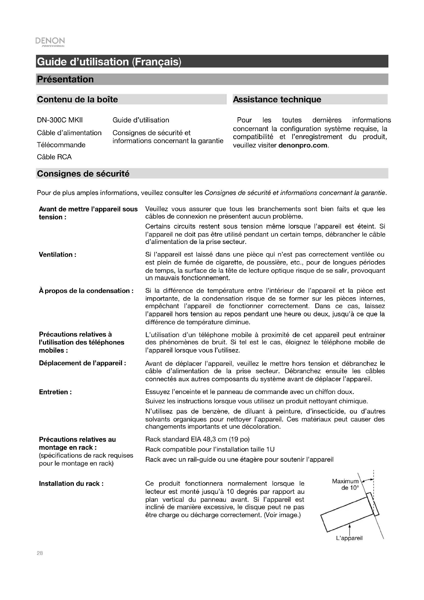 Câble d’alimentation Télécommande Câble RCA Guide d’utilisation Consignes de sécurité et informations concernant la garantie Pour les toutes dernières informations concernant la configuration système requise, la compatibilité et l’enregistrement du produit, veuillez visiter denonpro.com. Consignes de sécurité Pour de plus amples informations, veuillez consulter les Consignes de sécurité et informations concernant la garantie.
