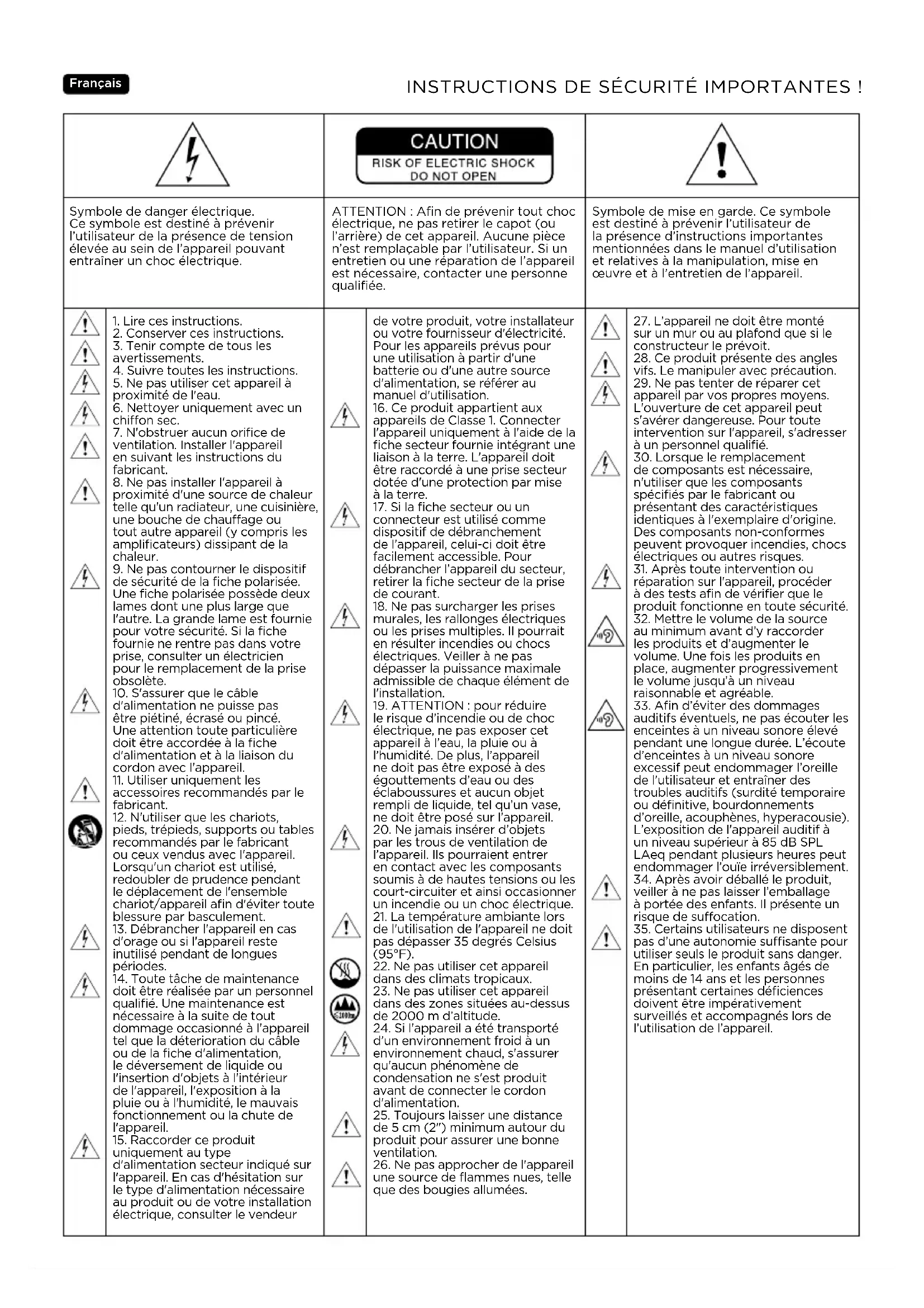 用戶手冊 / 取扱説明書 /INSTRUCTIONS DE SÉCURITÉ IMPORTANTES ! Français Symbole de danger électrique. Ce symbole est destiné à prévenir l’utilisateur de la présence de tension élevée au sein de l’appareil pouvant entraîner un choc électrique. ATTENTION : Afin de prévenir tout choc électrique, ne pas retirer le capot (ou l’arrière) de cet appareil. Aucune pièce n’est remplaçable par l’utilisateur. Si un entretien ou une réparation de l’appareil est nécessaire, contacter une personne qualifiée. Symbole de mise en garde. Ce symbole est destiné à prévenir l’utilisateur de la présence d’instructions importantes mentionnées dans le manuel d’utilisation et relatives à la manipulation, mise en œuvre et à l’entretien de l’appareil.