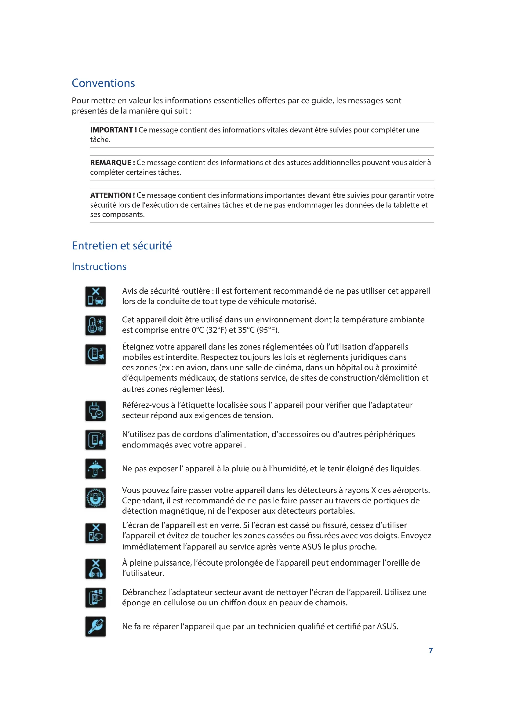 Marque CE La version commerciale de cet appareil est conforme aux directives 2004/108/CE sur la “Compatibilité électromagnétique” et 2006/95/CE sur les “Faibles tensions”. Exigence de sécurité électrique Les produits utilisant des courants électriques nominaux pouvant atteindre 6 A et pesant plus de 3 Kg doivent utiliser des cordons d’alimentation supérieurs ou équivalents à : H05VV-F, 3G, 0.75mm or H05VV-F, 2G, 0.75mm. À utiliser avec une source d’alimentation ITE certiée UL et destinée aux tablettes ASUS. Notice relative au revêtement de l’appareil IMPORTANT ! Pour maintenir le niveau de sécurité électrique et fournir une meilleure isolation, un revêtement a été appliqué pour isoler le châssis de cet appareil. Veuillez toutefois noter que les zones de l’appareil où se trouvent les diérentes interfaces de connexion ne disposent pas de ce revêtement spécial. Services de reprise et de recyclage d’ASUS Les programmes de recyclage et de reprise d’ASUS découlent de nos exigences en termes de standards élevés de respect de l’environnement. Nous souhaitons apporter à nos clients permettant de recycler de manière responsable nos produits, batteries et autres composants ainsi que nos emballages. Veuillez consulter le site http://csr.asus.com/english/Takeback.htm pour plus de détails sur les conditions de recyclage en vigueur dans votre pays. Notice Green ASUS ASUS se dévoue pour concevoir des produits/emballages respectueux de l’environnement pour protéger la santé des utilisateurs et minimiser l’impact sur l’environnement. La réduction du nombre de pages de ce manuel est conforme aux directives en matière de réduction des émissions de carbone. Pour consulter le mode d’emploi détaillé et obtenir d’autres informations sur ce produit, visitez le site de support d’ASUS à l’adresse suivante : http://www.asus.com/support/. “For DTS patents, see httppatents.dts.com. Manufactured under license from DTS Licensing Limited. DTS, DTS-HD, the Symbol, & DTS or DTS-HD and the Symbol together are registered trademarks, and DTS-HD Premium Sound is a trademark of DTS, Inc. c DTS, Inc. All Rights Reserved.”Appendice