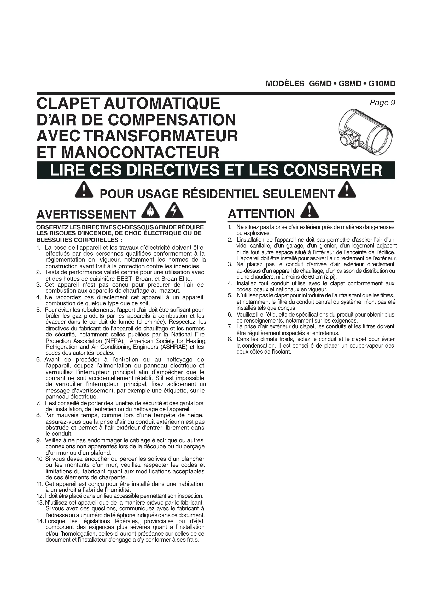 lacondensation. Il est conseillé de placer un coupe-vapeur des deux côtés de l’isolant.MODÈLES G6MD • G8MD • G10MD Page 10 EMPLACEMENT DE LA PRISE D’AIR EXTÉRIEUR La conception et l’emplacement adéquats de la prise d’air extérieur sont indispensables au bon fonctionnement et à la fiabilité du clapet pour faire pénétrer de l’air frais dans la maison. Il importe de respecter les exigences suivantes lors du positionnement de la prise d’air :
