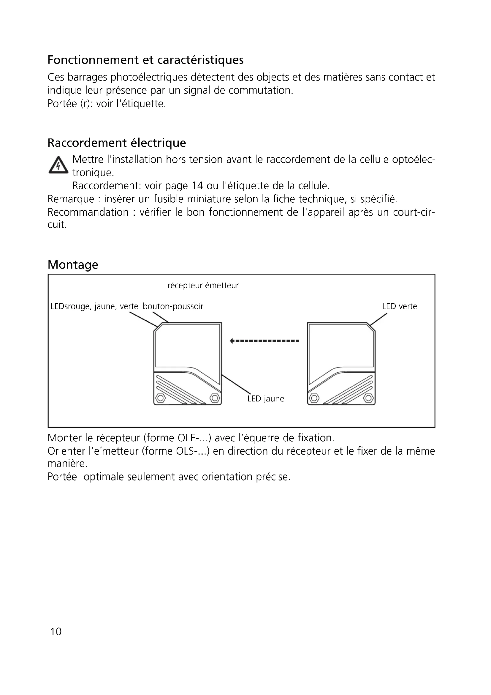 Press for 10s. The red LED starts to flash fast after 2 s. Then the yellow and green LED's flash alternately. After 8 s all LED's go off, the output function has changed from light- on mode to dark-on mode (or vice versa). LED red error in object detection, e.g. maladjustment, soiling of the lenses LED’s yellow + red flashing alternately, 2Hz: output short-circuited flashing alternately, 1Hz: internal malfunction (output is not switched) LED yellow output is switched LED green unit is ready for operationFonctionnement et caractéristiques Ces barrages photoélectriques détectent des objects et des matières sans contact et indique leur présence par un signal de commutation. Portée (r): voir l'étiquette. Raccordement électrique Mettre l'installation hors tension avant le raccordement de la cellule optoélec- tronique. Raccordement: voir page 14 ou l'étiquette de la cellule. Remarque : insérer un fusible miniature selon la fiche technique, si spécifié. Recommandation : vérifier le bon fonctionnement de l'appareil après un court-cir- cuit. Montage Monter le récepteur (forme OLE-...) avec l’équerre de fixation. Orienter l’e´metteur (forme OLS-...) en direction du récepteur et le fixer de la même manière. Portée optimale seulement avec orientation précise.