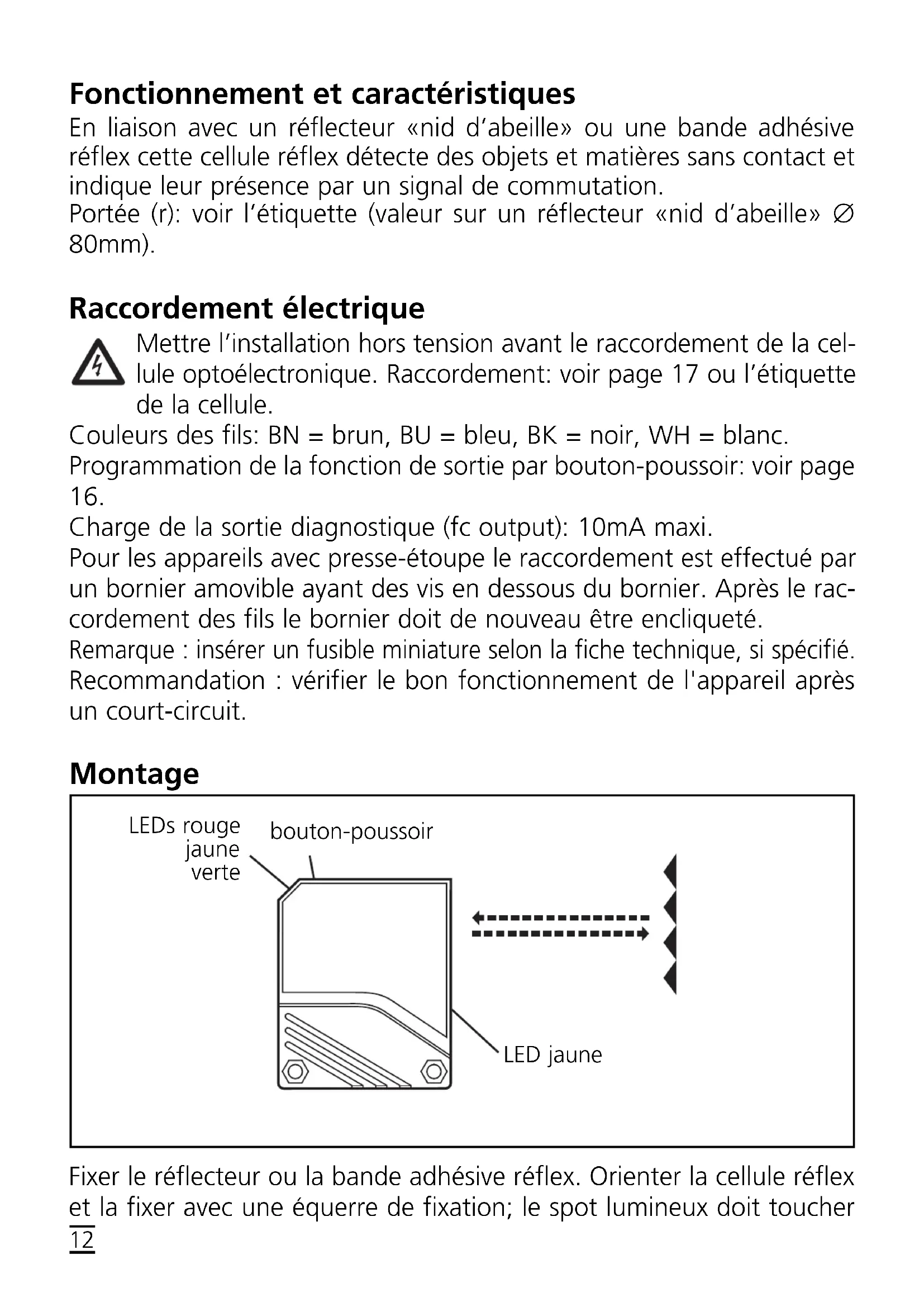 Press for 10s. The red LED starts to flash fast after 2s. Then the yellow and green LEDs flash alternately. After 8s all LEDs go off, the output function has chan- ged from light-on mode to dark-on mode (or vice versa). LED green is lit Unit is ready for operation. LED yellow is lit Output is switched. LEDs yellow + red Flash alternately, 2 Hz: output short-circuited. Flash alternately, 1 Hz: internal malfunction (output is not switched). LED red is lit Error in object detection, e.g. maladjustment, soiling of the lenses.Fonctionnement et caractéristiques En liaison avec un réflecteur «nid d’abeille» ou une bande adhésive réflex cette cellule réflex détecte des objets et matières sans contact et indique leur présence par un signal de commutation. Portée (r): voir l’étiquette (valeur sur un réflecteur «nid d’abeille» ∅ 80mm). Raccordement électrique Mettre l’installation hors tension avant le raccordement de la cel- lule optoélectronique. Raccordement: voir page 17 ou l’étiquette de la cellule. Couleurs des fils: BN = brun, BU = bleu, BK = noir, WH = blanc. Programmation de la fonction de sortie par bouton-poussoir: voir page