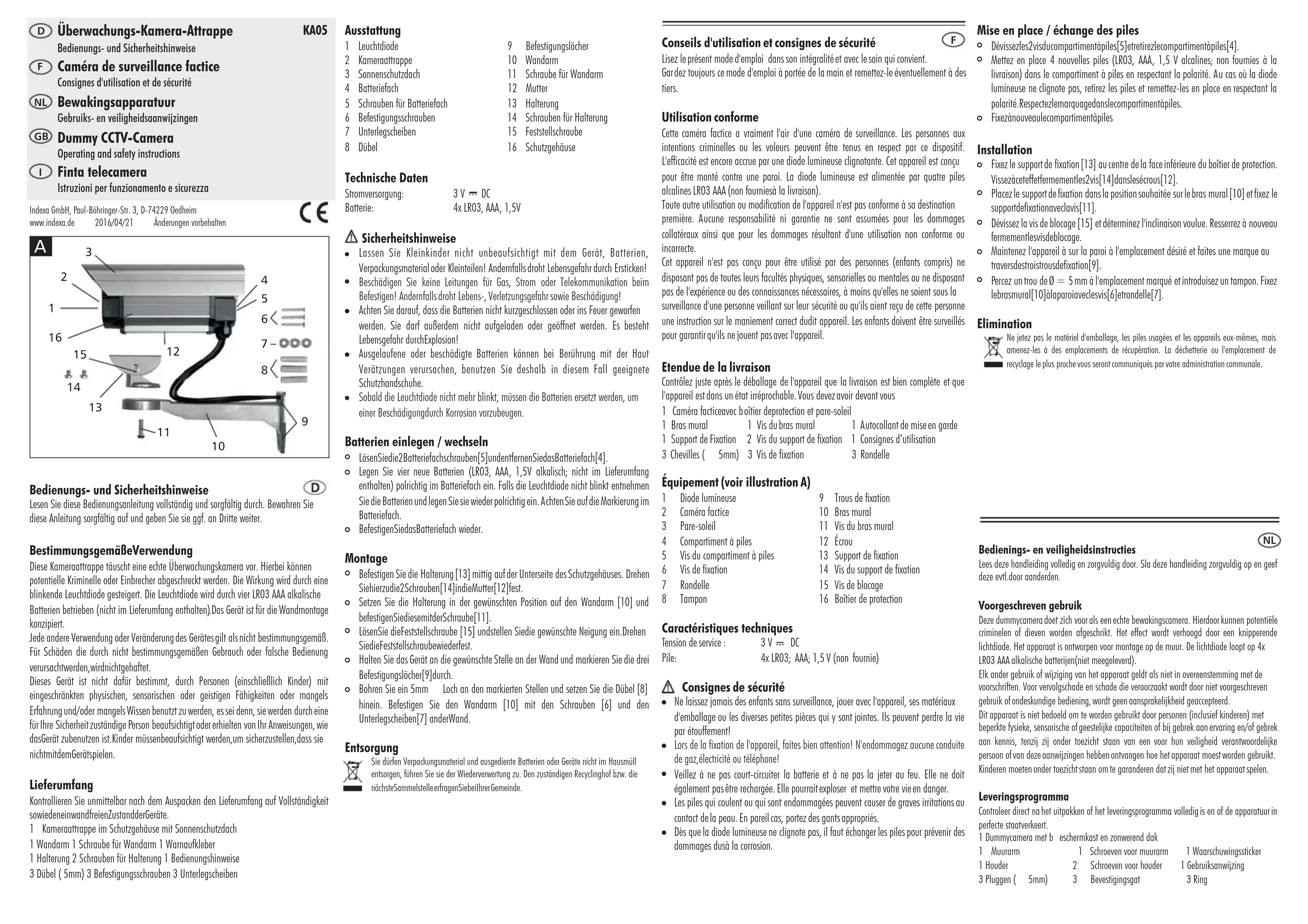 Conseils d'utilisation et consignes de sécurité Équipement (voir illustration A) Gar Cette caméra factice a vraiment l'air d'une caméra de surveillance. Les personnes aux intentions criminelles ou les voleurs peuvent être tenus en respect par ce dispositif. L'efficacité est encore accrue par une diode lumineuse clignotante. Cet appareil est conçu pour être monté contre une paroi. La diode lumineuse est alimentée par quatre piles alcalines (non fourniesà la livraison). oîtier deprotection et pare-soleil Bras mural Vis dubras mural Support de Vis du support de fixation Vis de fixation 3 Rondelle 1 Diode lumineuse 9 Trous de fixation 2 Caméra factice 10 Bras mural 3 Pare-soleil 11 Vis du bras mural 4 Compartiment à piles 12 Écrou 5 Vis du compartiment à piles 13 Support de fixation 6 Vis de fixation 14 Vis du support de fixation 7 Rondelle 15 Vis de blocage 8 Tampon 16 Boîtier de protection Dès que la diode lumineuse ne clignote pas, il faut échanger les piles pour prévenir des dommages dusà la corrosion. Lisez leprésent mode d'emploi dans son intégralité et avec lesoin qui convient. dez toujours ce mode d'emploi à portée de la main et remettez-le éventuellement à des tiers. Toute autre utilisation ou modification de l'appareil n'est pas conforme à sa destination première. Aucune responsabilité ni garantie ne sont assumées pour les dommages collatéraux ainsi que pour les dommages résultant d'une utilisation non conforme ou incorrecte. Cet appareil n'est pas conçu pour être utilisé par des personnes (enfants compris) ne disposant pas de toutes leurs facultés physiques, sensorielles ou mentales ou ne disposant pas de l'expérience ou des connaissances nécessaires, à moins qu'elles ne soient sous la surveillance d'une personne veillant sur leur sécurité ou qu'ils aient reçu de cette personne une instruction sur le maniement correct dudit appareil. Les enfants doivent être surveillés pour garantirqu'ils ne jouent pasavec l'appareil. Contrôlez juste après le déballage de l'appareil que la livraison est bien complète et que l'appareil estdans un état irréprochable.Vous devezavoir devant vous Tension de service : 3 V DC Pile: 4x LR03; AAA; 1,5 V (non fournie) Ne laissez jamais des enfants sans surveillance, jouer avec l'appareil, ses matériaux d'emballage ou les diverses petites pièces qui y sont jointes. Ils peuvent perdre la vie par étouffement! Veillez à ne pas court-circuiter la batterie et à ne pas la jeter au feu. Elle ne doit également pasêtre rechargée. Elle pourraitexploser et mettre votre vieen danger. Les piles qui coulent ou qui sont endommagées peuvent causer de graves irritations au contact dela peau. En pareilcas, portez des gants appropriés. Utilisation conforme Etendue de la livraison Caractéristiques techniques Consignes de sécurité