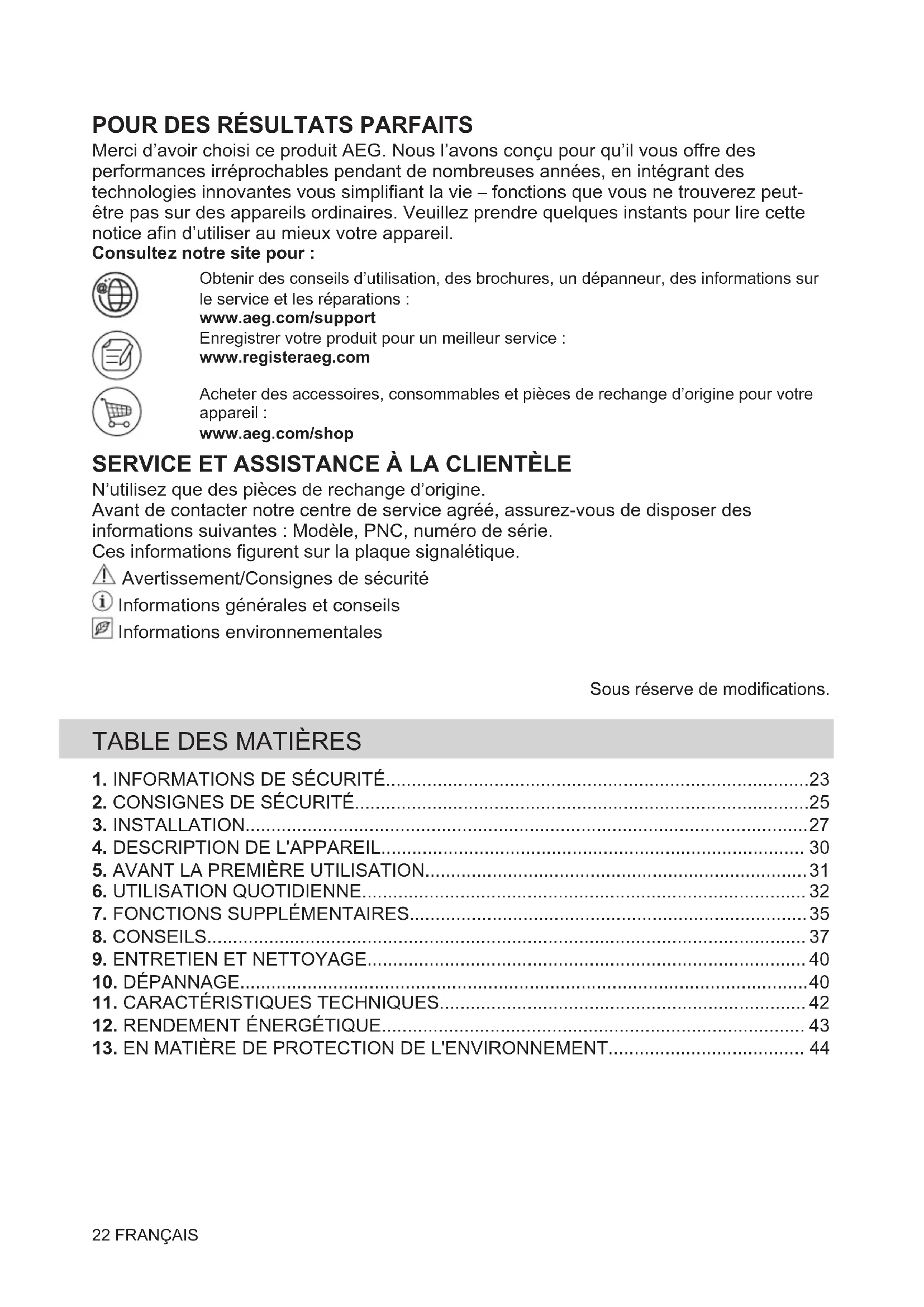 Merci d’avoir choisi ce produit AEG. Nous l’avons conçu pour qu’il vous offre des performances irréprochables pendant de nombreuses années, en intégrant des technologies innovantes vous simplifiant la vie – fonctions que vous ne trouverez peut- être pas sur des appareils ordinaires. Veuillez prendre quelques instants pour lire cette notice afin d’utiliser au mieux votre appareil. Consultez notre site pour : Obtenir des conseils d’utilisation, des brochures, un dépanneur, des informations sur le service et les réparations : www.aeg.com/support Enregistrer votre produit pour un meilleur service : www.registeraeg.com Acheter des accessoires, consommables et pièces de rechange d’origine pour votre appareil : www.aeg.com/shop
