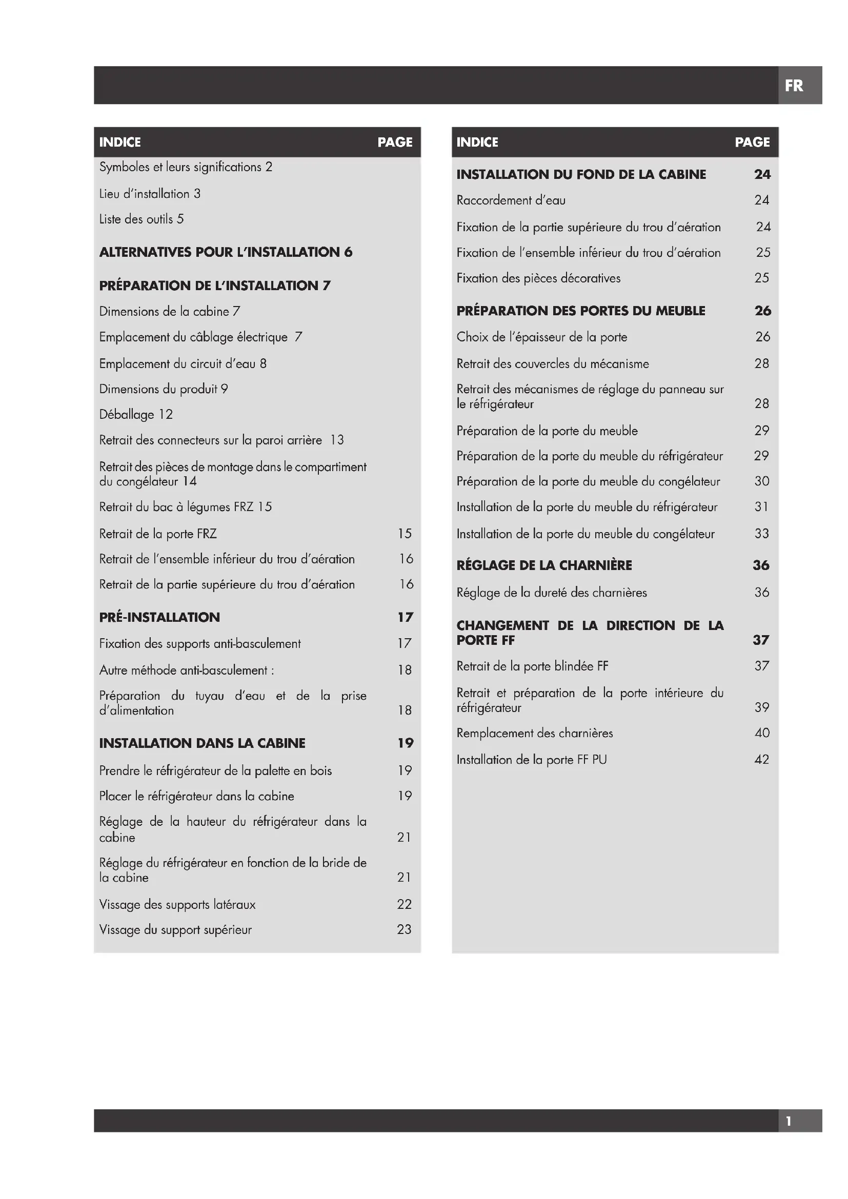Prendre le réfrigérateur de la palette en bois 19 Placer le réfrigérateur dans la cabine 19 Réglage de la hauteur du réfrigérateur dans la cabine 21 Réglage du réfrigérateur en fonction de la bride de la cabine 21 Vissage des supports latéraux 22 Vissage du support supérieur 23 INDICE PAGE
