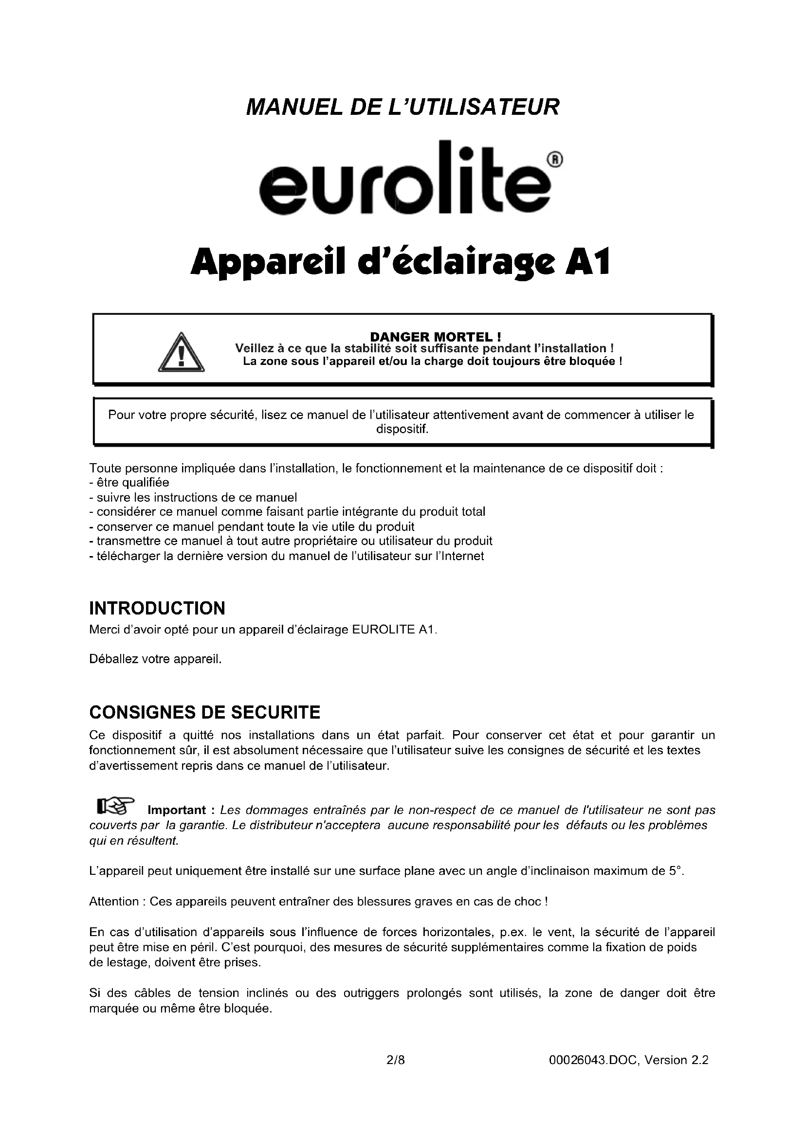 Toute personne impliquée dans l’installation, le fonctionnement et la maintenance de ce dispositif doit : - être qualifiée - suivre les instructions de ce manuel - considérer ce manuel comme faisant partie intégrante du produit total - conserver ce manuel pendant toute la vie utile du produit - transmettre ce manuel à tout autre propriétaire ou utilisateur du produit - télécharger la dernière version du manuel de l’utilisateur sur l’Internet INTRODUCTION Merci d’avoir opté pour un appareil d’éclairage EUROLITE A1. Déballez votre appareil.