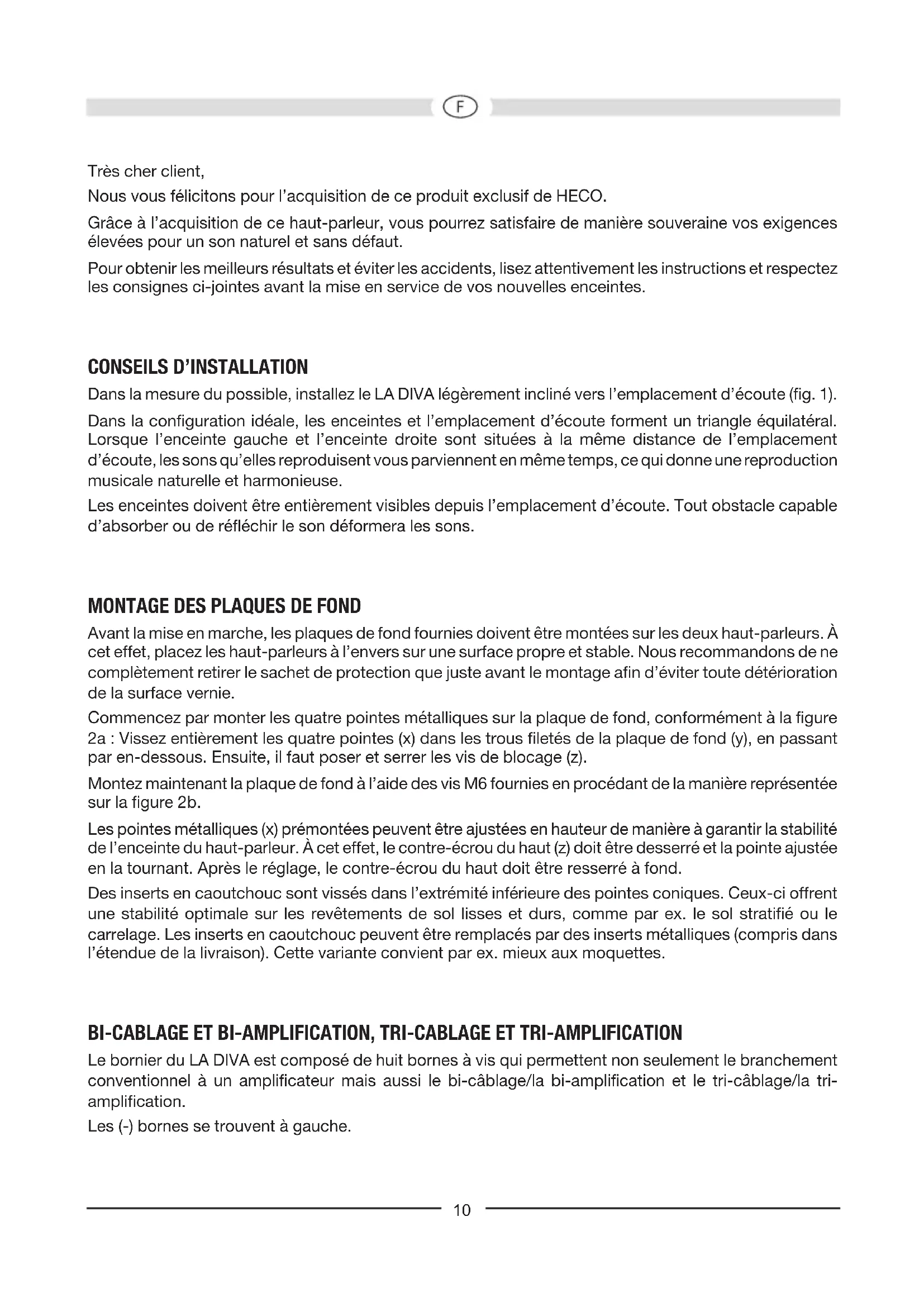Le bornier du LA DIVA est composé de huit bornes à vis qui permettent non seulement le branchement conventionnel à un amplificateur mais aussi le bi-câblage/la bi-amplification et le tri-câblage/la tri- amplification. Les (-) bornes se trouvent à gauche.11 Les bornes supérieures sont reliées à la voie tweeter, les bornes centrales à la voie médium du diviseur de fréquence et les bornes inférieures à la voie woofer. La borne de raccordement supplémentaire située en haut à droite permet d’augmenter les aigus de 2dB, et l’autre borne située au centre à droite permet de réduire les médiums de 2dB. Le réglage adéquat dépend de la salle, de la position des haut-parleurs et bien entendu des préférences personnelles. Dans les pièces fortement feutrées (dans lesquelles se trouvent par ex. de lourds meubles capitonnés et des rideaux), il est recommandé de régler le tweeter sur +2dB, et en cas d’installation près d’un mur et dans les pièces peu feutrées de régler le haut-parleur des médiums sur -2dB. Le bi-câblage signifie que les hautes et basses fréquences sont transportées par des câbles séparés. La bi-amplification nécessite un deuxième câble et un deuxième amplificateur de puissance. Le tri-câblage nécessite un troisième câble et la tri-amplification un troisième amplificateur. 4 câbles de pontage sont livrés avec l’appareil. Pour brancher l’appareil de manière conventionnelle, reliez les bornes des haut-parleurs avec les câbles de pontage en Y (1 cosse de câble et 2 fiches bananes) comme représenté sur les illustrations 3 a – d. Pour le bi-câblage et la bi-amplification, utilisez les autres câbles de pontage (1 cosse de câble et 1 fiche banane) comme représenté sur les illustrations 3 e – l. Pour le tri-câblage et la tri-amplification, aucun câble de pontage ne doit être branché. Le branchement à l’amplificateur/aux amplificateurs est représenté sur les illustrations 3 m – t. LE BRANCHEMENT DE VOS ENCEINTES HECO LA DIVA