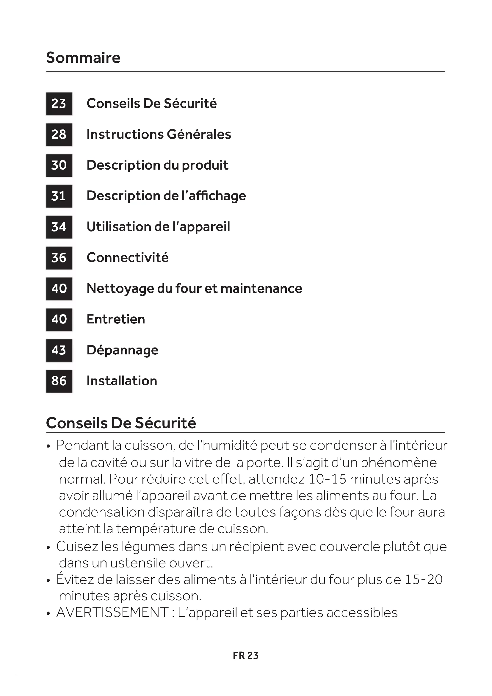 - Pendant la cuisson, de l’humidité peut se condenser à l’intérieur de la cavité ou sur la vitre de la porte. Il s’agit d’un phénomène normal. Pour réduire cet eet, attendez 10-15 minutes après avoir allumé l’appareil avant de mettre les aliments au four. La condensation disparaîtra de toutes façons dès que le four aura atteint la température de cuisson.