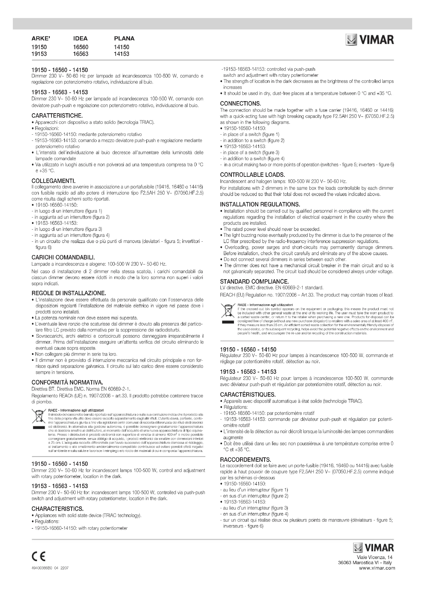 if they measure less than 25 cm. An efficient sorted waste collection for the environmentally friendly disposal of the used device, or its subsequent recycling, helps avoid the potential negative effects on the environment and people’s health, and encourages the re-use and/or recycling of the construction materials. 19150 - 16560 - 14150 Régulateur 230 V~ 50-60 Hz pour lampes à incandescence 100-500 W, commande et réglage par potentiomètre rotatif, détection au noir. 19153 - 16563 - 14153 Régulateur 230 V~ 50-60 Hz pour: lampes à incandescence 100-500 W, commande avec déviateur push-push et régulation par potentiomètre rotatif, détection au noir. CARACTÉRISTIQUES.