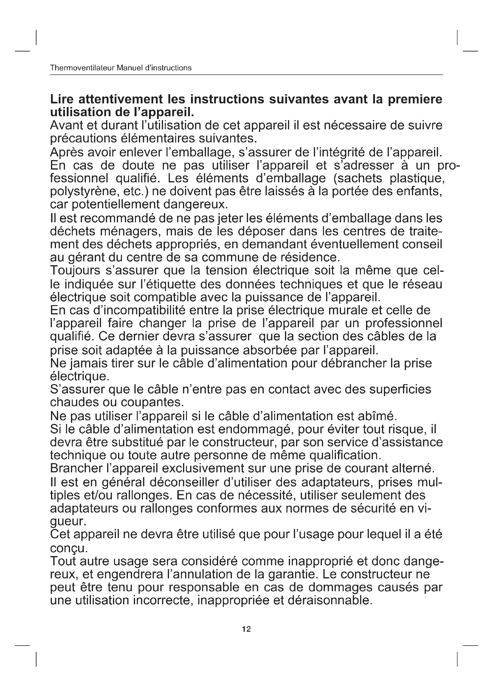 Pour éviter tout risque d’échauffement il est recommandé de dérouler entièrement le câble d’alimentation et de débrancher l’appareil de la prise de courant en cas d’inutilisation. Avant d’effectuer toute opération de nettoyage ou entretien, débran- cher l’appareil de la prise de courant électrique. Ne jamais immerger l’appareil dans l’eau ou d’autres liquides. Ne pas toucher l’appareil avec les mains et pieds mouillés ou humides. Ne pas utiliser l’appareil si vous êtes pieds nus. Ne pas laisser l’appareil exposé aux agents atmosphériques comme la pluie, le soleil … Ne pas laisser l’appareil près d’une source de chaleur (ex. Radiateur) Ne pas laisser les enfants, les personnes avec des capacités physi- ques, sensorielles ou mentales réduites, ou manquant d’expérience ou de connaissance technique, utiliser cet appareil sans surveillance S’assurer que les enfants ne jouent pas avec cet appareil. Dès lors que l’appareil doit être détruit, il est recom- mandé de couper le câble d’alimentation, et de reti- rer toutes les parties susceptibles de présenter un quelconque danger, en particulier pour les enfants qui pourraient utiliser cet appareil comme un jeu. Avertissements d’utilisation Cet appareil peut être utilisé par des enfants âgés de 8 ans et plus, ainsi que par des personnes dont les capacités physiques, sensoriel- les ou mentales sont réduites, ou dont l’expérience et les connaissan- ces sont limitées, à condition qu’elles aient reçu des instructions complètes sur l’utilisation sûre de l’appareil et qu’elles comprennent les risques encourus. Les enfants ne doivent pas jouer avec cet appareil. Le nettoyage et l’entretien ne doivent pas être effectués par des en- fants sans surveillance. Les enfants de moins de 3 ans ne doivent pas jouer avec l’appareil ou rester à proximité sans surveillance permanente. Les enfants âgés de 3 à 8 ans ne peuvent allumer ou éteindre l’ap- pareil que si celui-ci a été placé ou installé dans sa position normale d’utilisation, et si les enfants sont sous étroite surveillance ou ont reçu des instructions complètes sur l’utilisation sûre de l’appareil et comprennent les risques encourus.Thermoventilateur Manuel d’instructions