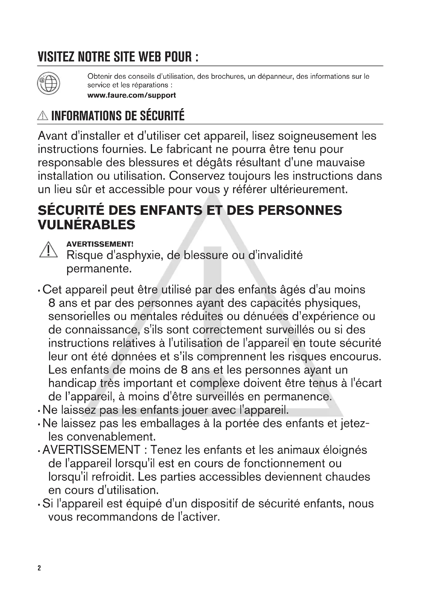 Avant d'installer et d'utiliser cet appareil, lisez soigneusement les instructions fournies. Le fabricant ne pourra être tenu pour responsable des blessures et dégâts résultant d'une mauvaise installation ou utilisation. Conservez toujours les instructions dans un lieu sûr et accessible pour vous y référer ultérieurement. SÉCURITÉ DES ENFANTS ET DES PERSONNES VULNÉRABLES AVERTISSEMENT! Risque d'asphyxie, de blessure ou d'invalidité permanente.