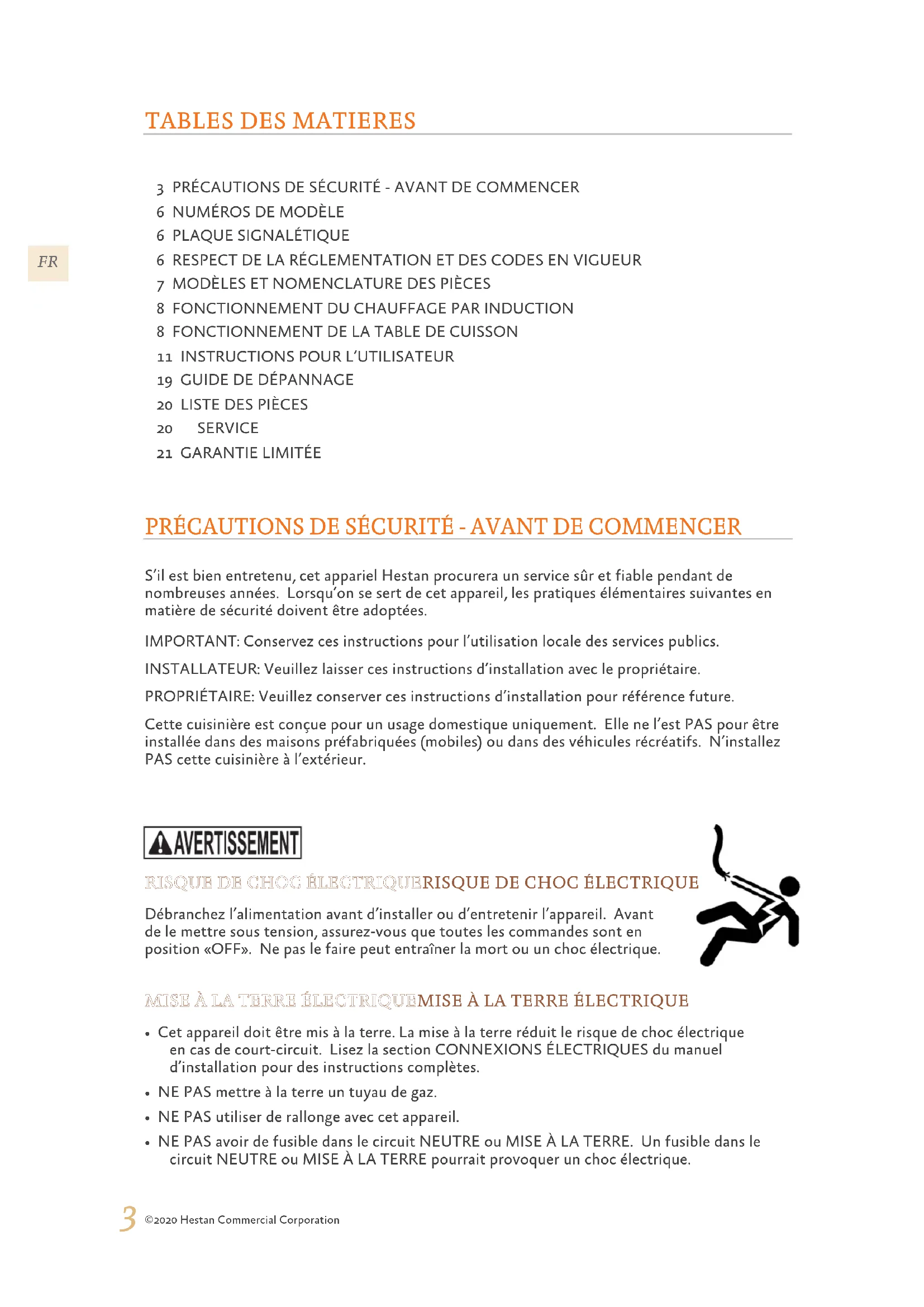 S’il est bien entretenu, cet appariel Hestan procurera un service sûr et fiable pendant de nombreuses années. Lorsqu’on se sert de cet appareil, les pratiques élémentaires suivantes en matière de sécurité doivent être adoptées. IMPORTANT: Conservez ces instructions pour l’utilisation locale des services publics. INSTALLATEUR: Veuillez laisser ces instructions d’installation avec le propriétaire. PROPRIÉTAIRE: Veuillez conserver ces instructions d’installation pour référence future. Cette cuisinière est conçue pour un usage domestique uniquement. Elle ne l’est PAS pour être installée dans des maisons préfabriquées (mobiles) ou dans des véhicules récréatifs. N’installez PAS cette cuisinière à l’extérieur. PRÉCAUTIONS DE SÉCURITÉ - AVANT DE COMMENCER RISQUE DE CHOC ÉLECTRIQUERISQUE DE CHOC ÉLECTRIQUE Débranchez l’alimentation avant d’installer ou d’entretenir l’appareil. Avant de le mettre sous tension, assurez-vous que toutes les commandes sont en position «OFF». Ne pas le faire peut entraîner la mort ou un choc électrique. MISE À LA TERRE ÉLECTRIQUEMISE À LA TERRE ÉLECTRIQUE