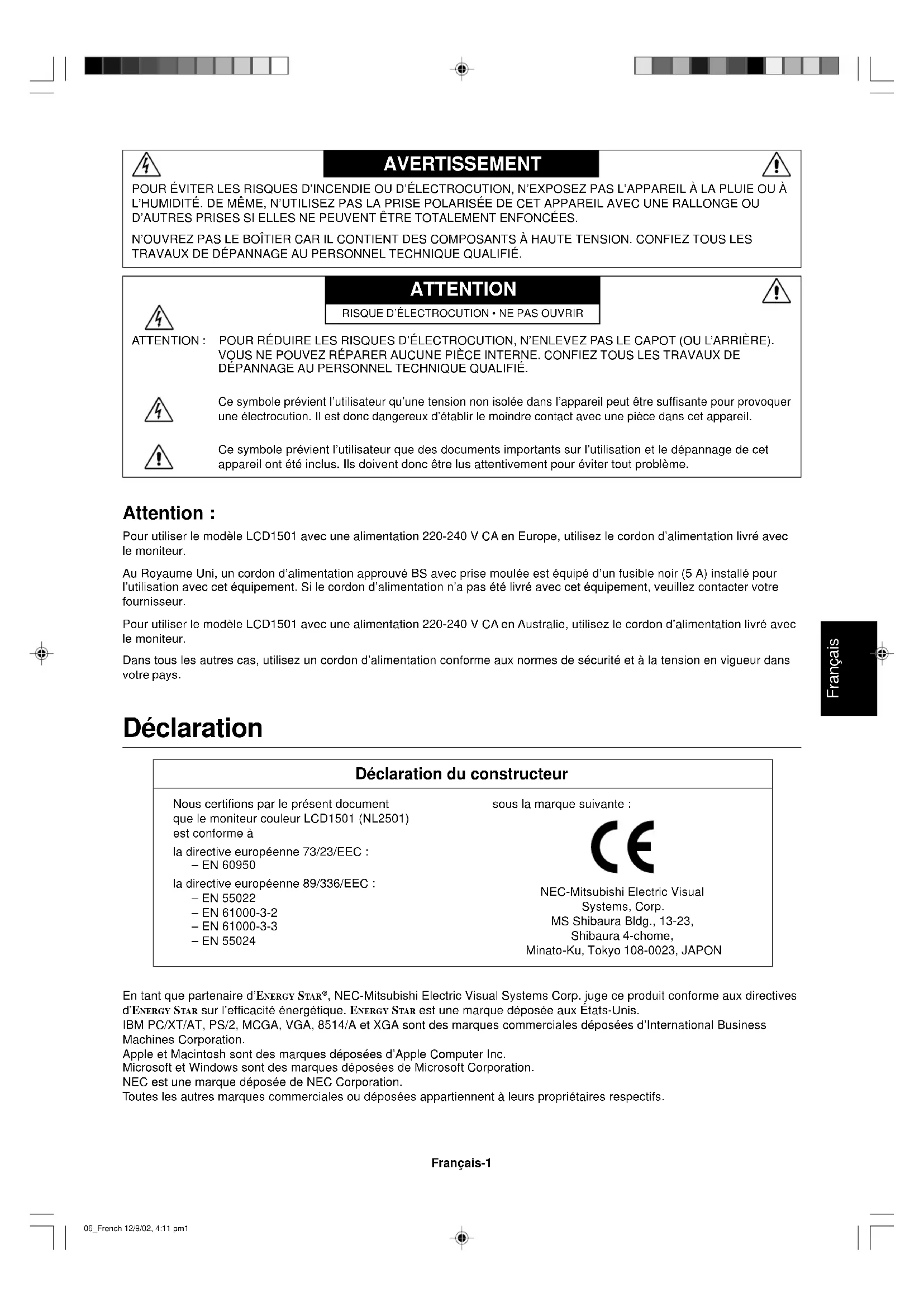 , NEC-Mitsubishi Electric Visual Systems Corp. juge ce produit conforme aux directives d’ENERGY STAR sur l’efficacité énergétique. ENERGY STAR est une marque déposée aux États-Unis. IBM PC/XT/AT, PS/2, MCGA, VGA, 8514/A et XGA sont des marques commerciales déposées d’International Business Machines Corporation. Apple et Macintosh sont des marques déposées d’Apple Computer Inc. Microsoft et Windows sont des marques déposées de Microsoft Corporation. NEC est une marque déposée de NEC Corporation. Toutes les autres marques commerciales ou déposées appartiennent à leurs propriétaires respectifs. Nous certifions par le présent document que le moniteur couleur LCD1501 (NL2501) est conforme à la directive européenne 73/23/EEC : – EN 60950 la directive européenne 89/336/EEC : – EN 55022 – EN 61000-3-2 – EN 61000-3-3 – EN 55024 sous la marque suivante : NEC-Mitsubishi Electric Visual Systems, Corp. MS Shibaura Bldg., 13-23, Shibaura 4-chome, Minato-Ku, Tokyo 108-0023, JAPON Attention : Pour utiliser le modèle LCD1501 avec une alimentation 220-240 V CA en Europe, utilisez le cordon d’alimentation livré avec le moniteur. Au Royaume Uni, un cordon d’alimentation approuvé BS avec prise moulée est équipé d’un fusible noir (5 A) installé pour l’utilisation avec cet équipement. Si le cordon d’alimentation n’a pas été livré avec cet équipement, veuillez contacter votre fournisseur. Pour utiliser le modèle LCD1501 avec une alimentation 220-240 V CA en Australie, utilisez le cordon d’alimentation livré avec le moniteur. Dans tous les autres cas, utilisez un cordon d’alimentation conforme aux normes de sécurité et à la tension en vigueur dans votre pays. POUR ÉVITER LES RISQUES D’INCENDIE OU D’ÉLECTROCUTION, N’EXPOSEZ PAS L’APPAREIL À LA PLUIE OU À L’HUMIDITÉ. DE MÊME, N’UTILISEZ PAS LA PRISE POLARISÉE DE CET APPAREIL AVEC UNE RALLONGE OU D’AUTRES PRISES SI ELLES NE PEUVENT ÊTRE TOTALEMENT ENFONCÉES. N’OUVREZ PAS LE BOÎTIER CAR IL CONTIENT DES COMPOSANTS À HAUTE TENSION. CONFIEZ TOUS LES TRAVAUX DE DÉPANNAGE AU PERSONNEL TECHNIQUE QUALIFIÉ. AVERTISSEMENT ATTENTION ATTENTION : POUR RÉDUIRE LES RISQUES D’ÉLECTROCUTION, N’ENLEVEZ PAS LE CAPOT (OU L’ARRIÈRE). VOUS NE POUVEZ RÉPARER AUCUNE PIÈCE INTERNE. CONFIEZ TOUS LES TRAVAUX DE DÉPANNAGE AU PERSONNEL TECHNIQUE QUALIFIÉ. Ce symbole prévient l’utilisateur qu’une tension non isolée dans l’appareil peut être suffisante pour provoquer une électrocution. Il est donc dangereux d’établir le moindre contact avec une pièce dans cet appareil. Ce symbole prévient l’utilisateur que des documents importants sur l’utilisation et le dépannage de cet appareil ont été inclus. Ils doivent donc être lus attentivement pour éviter tout problème.