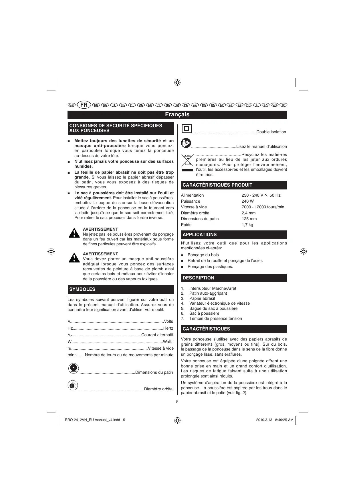 Mettez toujours des lunettes de sécurité et un masque anti-poussière lorsque vous poncez, en particulier lorsque vous tenez la ponceuse au-dessus de votre tête. N'utilisez jamais votre ponceuse sur des surfaces humides. La feuille de papier abrasif ne doit pas être trop grande. Si vous laissez le papier abrasif dépasser du patin, vous vous exposez à des risques de blessures graves. Le sac à poussières doit être installé sur l'outil et vidé régulièrement. Pour installer le sac à poussières, emboîtez la bague du sac sur la buse d'évacuation située à l'arrière de la ponceuse en la tournant vers la droite jusqu'à ce que le sac soit correctement fixé. Pour retirer le sac, procédez dans l'ordre inverse. .......................................Lisez le manuel d'utilisation ....................................Recyclez les matiè-res premières au lieu de les jeter aux ordures ménagères. Pour protéger l'environnement, l'outil, les accessoi-res et les emballages doivent être triés.