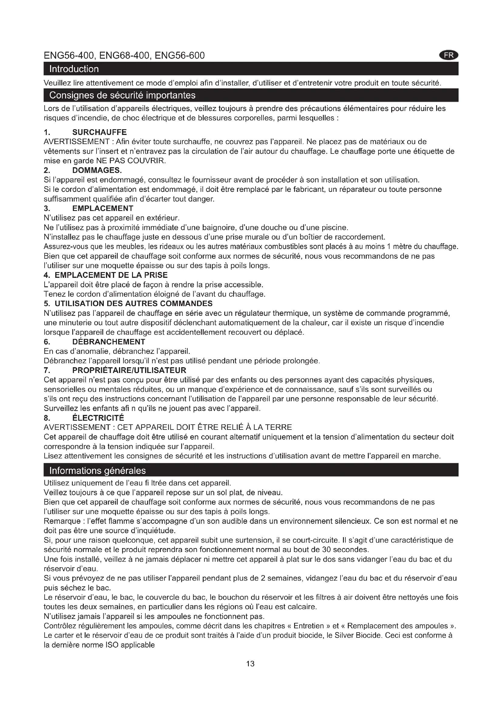 Cet appareil de chauffage doit être utilisé en courant alternatif uniquement et la tension d’alimentation du secteur doit correspondre à la tension indiquée sur l’appareil. Lisez attentivement les consignes de sécurité et les instructions d’utilisation avant de mettre l’appareil en marche. Informations générales Utilisez uniquement de l’eau fi ltrée dans cet appareil. Veillez toujours à ce que l’appareil repose sur un sol plat, de niveau. Bien que cet appareil de chauffage soit conforme aux normes de sécurité, nous vous recommandons de ne pas l’utiliser sur une moquette épaisse ou sur des tapis à poils longs. Remarque : l’effet fl amme s’accompagne d’un son audible dans un environnement silencieux. Ce son est normal et ne doit pas être une source d’inquiétude. Si, pour une raison quelconque, cet appareil subit une surtension, il se court-circuite. Il s’agit d’une caractéristique de sécurité normale et le produit reprendra son fonctionnement normal au bout de 30 secondes. Une fois installé, veillez à ne jamais déplacer ni mettre cet appareil à plat sur le dos sans vidanger l’eau du bac et du réservoir d’eau. Si vous prévoyez de ne pas utiliser l’appareil pendant plus de 2 semaines, vidangez l’eau du bac et du réservoir d’eau puis séchez le bac. Le réservoir d’eau, le bac, le couvercle du bac, le bouchon du réservoir et les fi ltres à air doivent être nettoyés une fois toutes les deux semaines, en particulier dans les régions où l’eau est calcaire. N’utilisez jamais l’appareil si les ampoules ne fonctionnent pas. Contrôlez régulièrement les ampoules, comme décrit dans les chapitres « Entretien » et « Remplacement des ampoules ». Le carter et le réservoir d’eau de ce produit sont traités à l’aide d’un produit biocide, le Silver Biocide. Ceci est conforme à la dernière norme ISO applicable