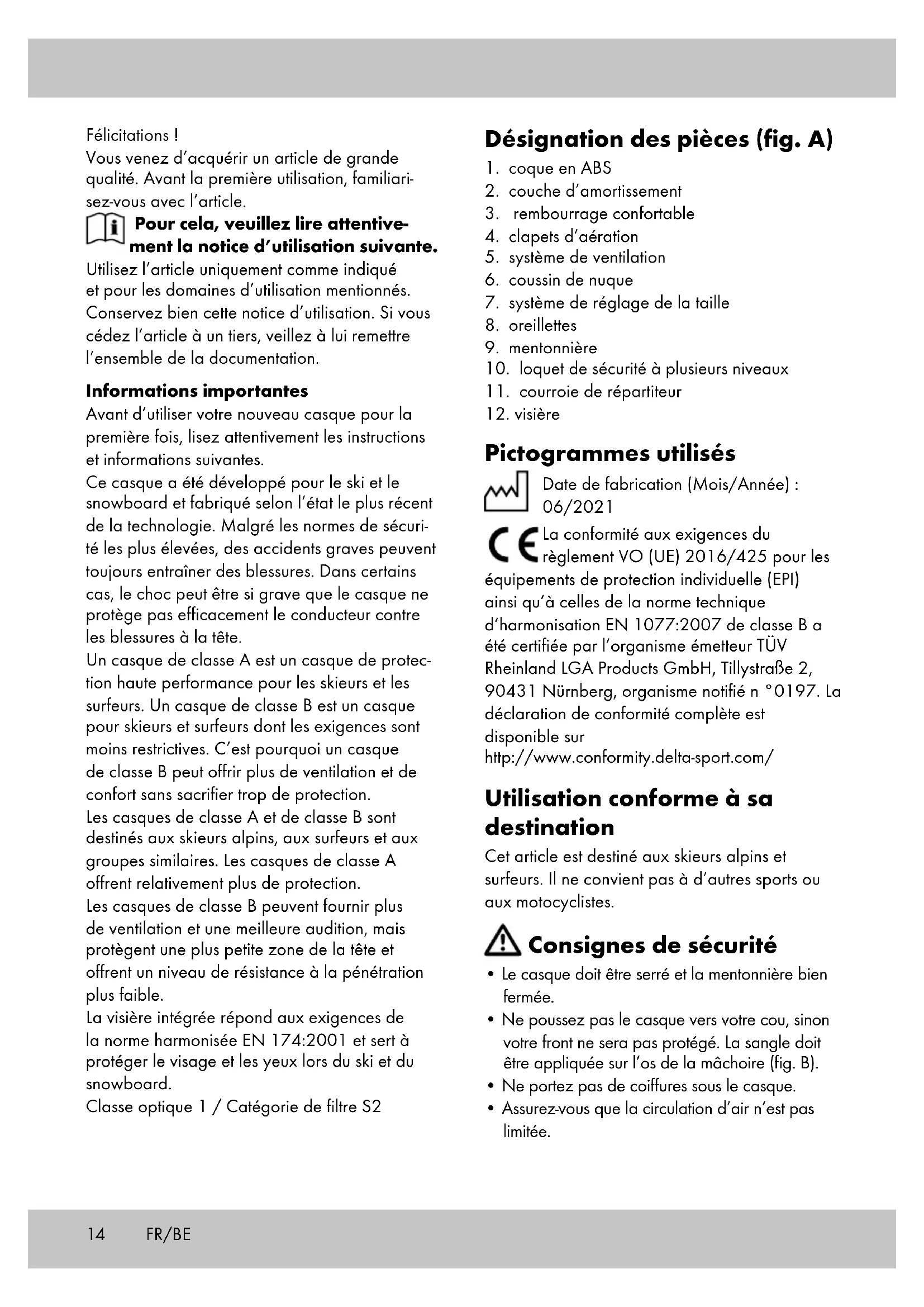 Pictogrammes utilisés Date de fabrication (Mois/Année) : 06/2021 La conformité aux exigences du règlement VO (UE) 2016/425 pour les équipements de protection individuelle (EPI) ainsi qu’à celles de la norme technique d’harmonisation EN 1077:2007 de classe B a été certifiée par l’organisme émetteur TÜV Rheinland LGA Products GmbH, Tillystraße 2, 90431 Nürnberg, organisme notifié n °0197. La déclaration de conformité complète est disponible sur http://www.conformity.delta-sport.com/ Utilisation conforme à sa destination Cet article est destiné aux skieurs alpins et surfeurs. Il ne convient pas à d’autres sports ou aux motocyclistes. Consignes de sécurité