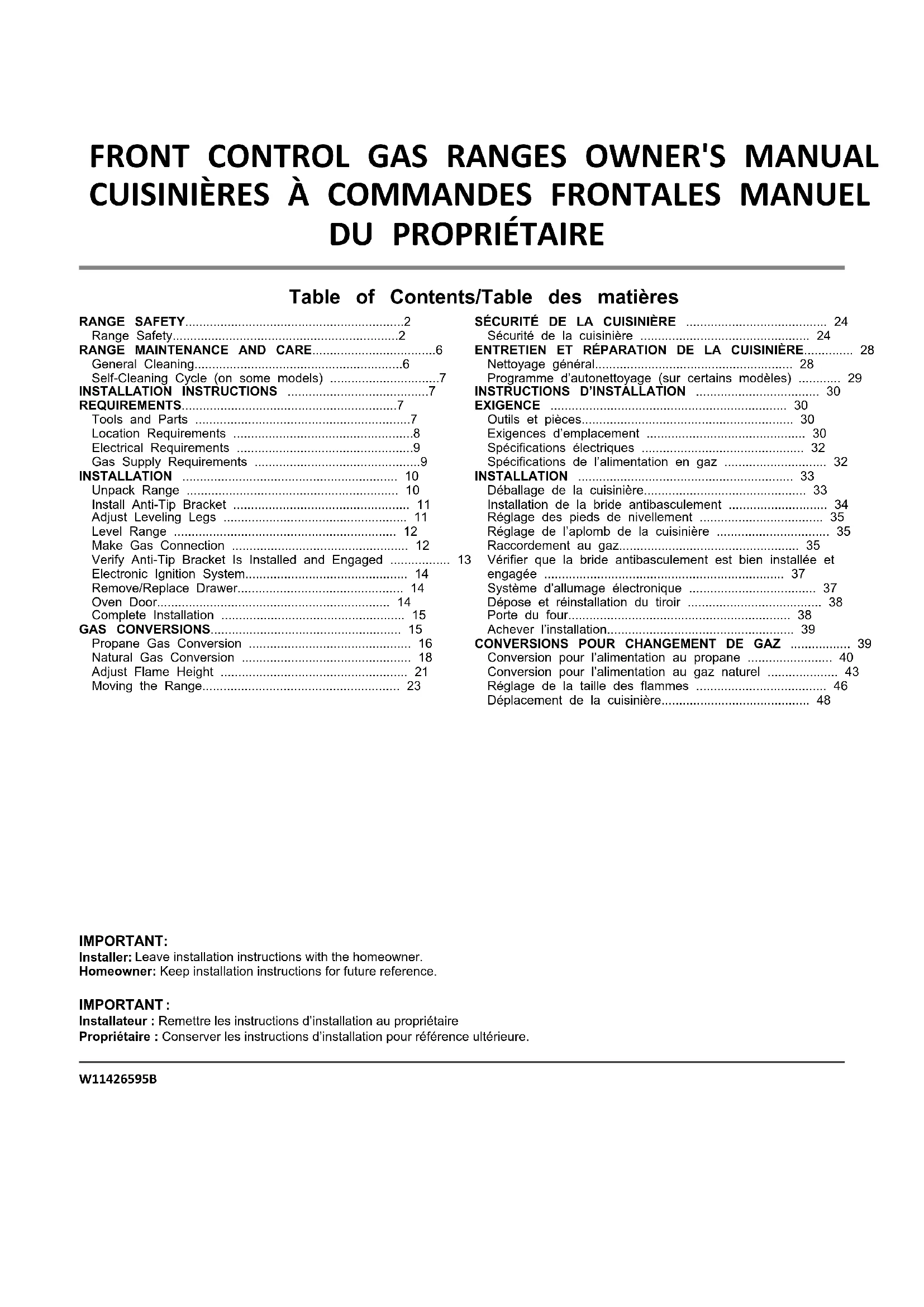 un chiffon humide. Pour quitter le programme d’autonettoyage appuyer sur la touche CANCEL (annulation). La porte se déverrouille dès que le four est froid.INSTRUCTIONS D’INSTALLATION EXIGENCE Outils et pièces Rassembler les outils et pièces nécessaires avant d’entreprendre l’installation. Lire et observer les instructions fournies avec chacun des outils de la liste ci-dessous. Outils nécessaires ■ Ruban à mesurer ■ Tournevis à lame plate ■ Tournevis cruciforme ■ Tournevis à lame plate de 1/8 po (3 mm) ■ Niveau ■ Perceuse manuelle ou électrique ■ Marteau ■ Clé ou pince ■ Clé à tuyauterie ■ Clé mixte de 15/16 po (2,4 cm) ■ Clé à cliquet 1/4 po ■ Tourne-écrou 3/8 po (1 cm) ■ Foret de 1/8 po (pour plancher de bois) ■ Crayon ou marqueur ■ Composé d’étanchéité des raccords filetés résistant au propane ■ Solution non corrosive de détection des fuites ■ Foret à maçonnerie à pointe carburée de 3/16 po (4,8 mm) (pour planchers en béton/céramique) (pour planchers en béton/ céramique) (Pour les cuisinières avec commandes encastrées/à l’avant) Pour la conversion pour l’alimentation au gaz propane/gaz naturel ■ Clé mixte de 3/8 po ■ Clé mixte de 1/2 po ■ Clé mixte de 5/8 po ■ Tourne-écrou 9/32 po ■ Tournevis Quadrex