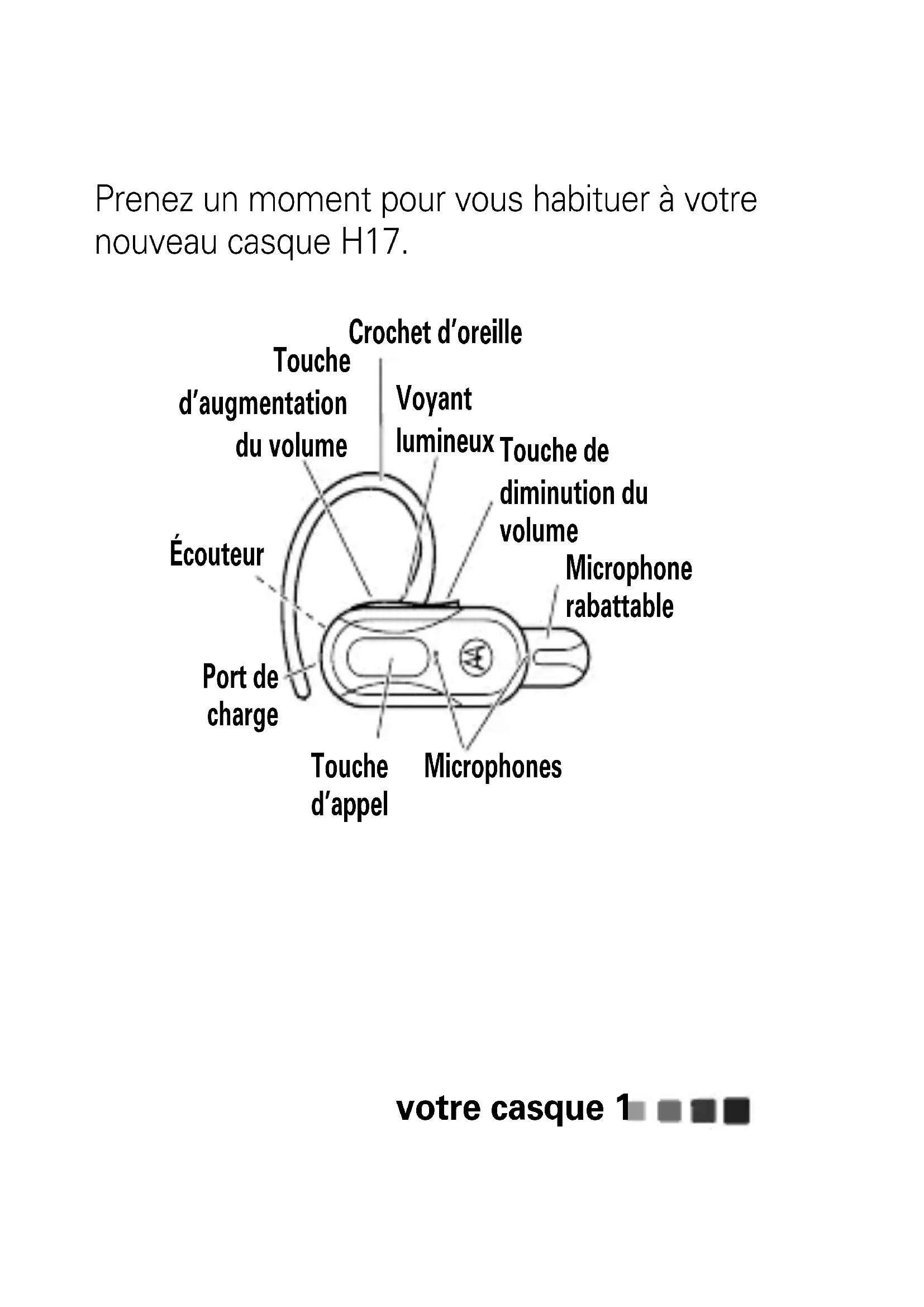 Pour obtenir un ajustement optimal, essayez tous les coussinets fournis.vérification de la batterie 13 vérification de la batterie Maintenez les deux touches de volume enfoncées lorsque aucun appel n’est en cours. Pour économiser l’énergie de la batterie, mettez le casque hors tension en rabattant le microphone lorsque vous ne l’utilisez pas pendant un certain temps. voyant lumineux guide vocal temps de conversation rouge «battery level is low » moins de 1,5 heure jaune «battery level is medium » entre 1,5 et 3,5 heures vert «battery level is high » plus de 3,5 heuresappels14 appels Pour... répondre à un appel Appuyez sur la touche d’appel. refuser un appel Maintenez une des touches de volume enfoncée jusqu’à ce que vous entendiez un son. faire un appel par composition vocale Appuyez sur la touche d’appel jusqu’à ce que vous entendiez un son. recomposer le dernier numéro Maintenez la touche d’appel enfoncée jusqu’à ce que vous entendiez un son. activer ou désactiver la sourdine Maintenez les deux touches de volume enfoncées jusqu’à ce que vous entendiez « mute on » ou « mute off ».appels 15 Conseil : lorsque le casque est connecté à deux téléphones, les guides vocaux facilitent l’utilisation de fonctions durant l’appel, notamment la composition vocale, la recomposition et la fin d’appel. Suivez les guides vocaux pour utiliser une fonction d’un des téléphones. mettre fin à un appel Appuyez sur la touche d’appel. répondre à un deuxième appel entrant Appuyez sur la touche d’appel. refuser le second appel entrant Maintenez enfoncée une des touches de volume jusqu’à ce que le casque émette un son. Pour...appels16 Remarque : votre casque fonctionne aussi bien en mode mains libres qu’en mode casque. L’accès aux fonctions d’appel dépend du mode pris en charge par votre téléphone. Consultez le guide de l’utilisateur qui accompagne votre téléphone. Remarque : certaines fonctions dépendent du téléphone ou du réseau.indicateurs d’état 17 indi cateurs d’ état voyant lumineux (chargeur branché) indicateur de casque état du casque rouge charge en cours (le niveau de charge de la batterie est inférieur à 50 %) jaune charge en cours (le niveau de charge de la batterie est supérieur à 50 %) vert charge terminéeindicateurs d’état18 voyant lumineux (chargeur débranché) indicateur de casque état du casque éteint hors tension trois clignotements en bleu mise sous tension/hors tension bleu fixe mode appariement/connexion clignotement rapide en bleu et en violet connexion réussie clignotement en bleu rapide appel entrant/sortant sur le téléphone 1indicateurs d’état 19 clignotement rapide en violet appel entrant/sortant sur le téléphone 2 impulsions lentes en bleu connecté (appel en cours) clignotement lent en bleu en attente (connecté à un téléphone) clignotement lent en vert en attente (connecté à deux téléphones) clignotement lent en rouge en attente (non connecté à un téléphone) impulsions lentes en violet connecté (appel en sourdine) indicateur de casque état du casqueindicateurs d’état20 Remarque : après 1 minute de conversation téléphonique ou 20 minutes d’inactivité, le voyant cesse de clignoter pour économiser l’énergie de la batterie, mais le casque demeure sous tension. rouge fixe tentative de connexion en cours clignotement rapide en rouge batterie faible indicateur de casque état du casquetrucs et conseils 21 trucs et conseil s activer/désactiver les guides vocaux Mettez le casque sous tension, puis maintenez l’une des touches de volume et la touche d’appel enfoncées jusqu’à ce que vous entendiez «voice prompts on » ou « voice prompts off ». rétablir les réglages d’origine Mise en garde : cette fonction efface toutes les données d’appariement enregistrées dans votre casque. Pour rétablir les réglages d’origine de votre casque, maintenez les touches de volume et d’appel enfoncées simultanément pendant 10 secondes lorsque le casque est sous tension, jusqu’à ce que vous entendiez « welcome to the Motorola H17 » et que le voyant lumineux devienne bleu et fixe.des problèmes?22 des prob lèmes? Le casque n’entre pas en mode d’appariement. Assurezvous que tous les appareils auxquels le casque a déjà été apparié sont hors tension. Si le voyant lumineux n’est pas fixe et bleu, mettez hors tension l’autre appareil ainsi que le casque, attendez dix secondes, puis remettez le casque sous tension. Attendez que le voyant lumineux devienne bleu et fixe, puis vous entendrez « ready to pair »