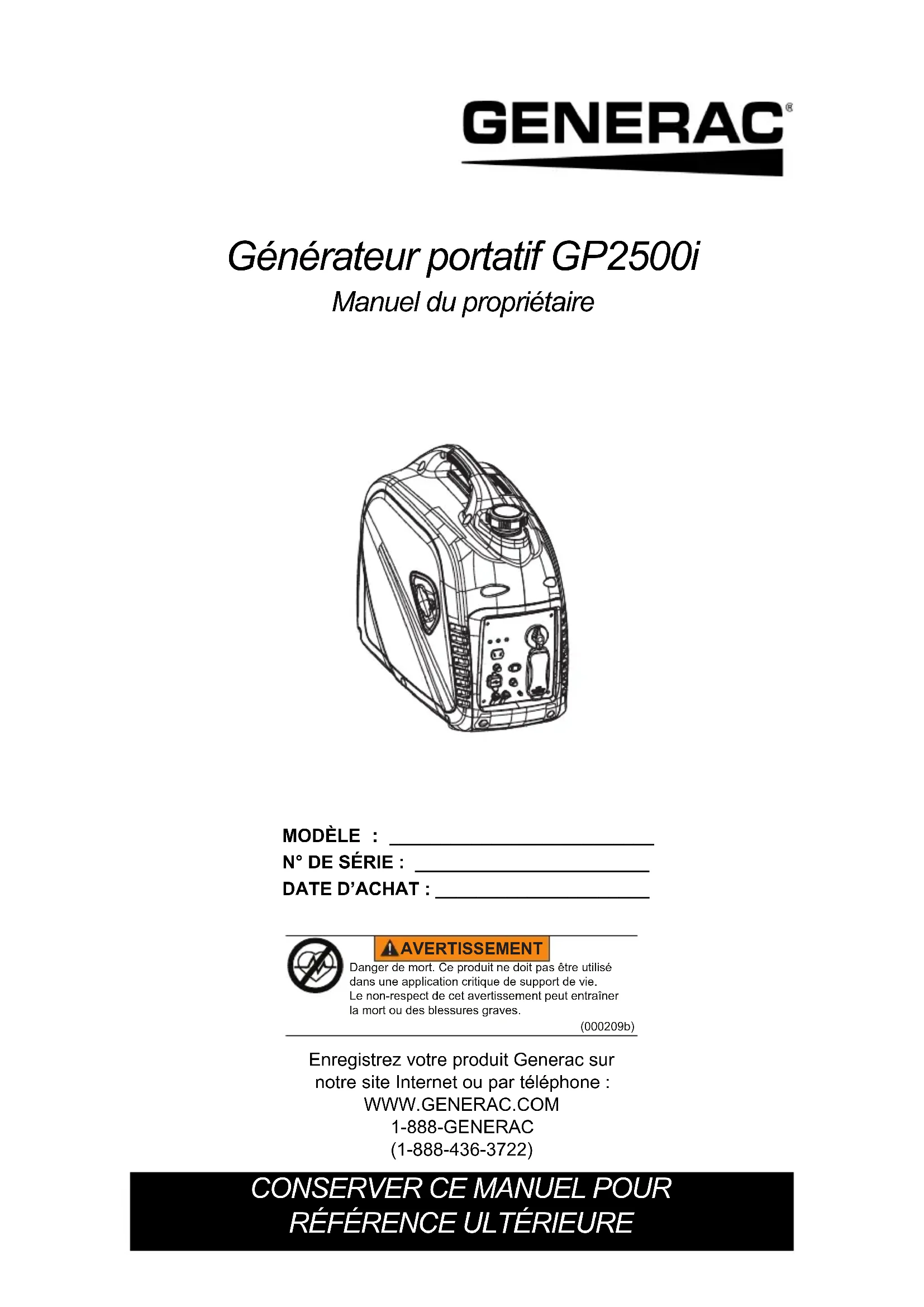 AVERTISSEMENT Danger de mort. Ce produit ne doit pas être utilisé dans une application critique de support de vie. Le non-respect de cet avertissement peut entraîner la mort ou des blessures graves. (000209b) Enregistrez votre produit Generac sur notre site Internet ou par téléphone :