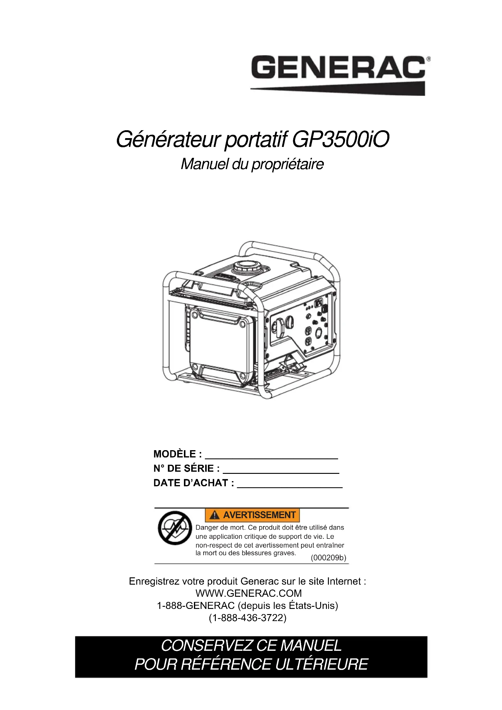 (000209b) Danger de mort. Ce produit doit être utilisé dans une application critique de support de vie. Le non-respect de cet avertissement peut entraîner la mort ou des blessures graves. AVERTISSEMENT Enregistrez votre produit Generac sur le site Internet :
