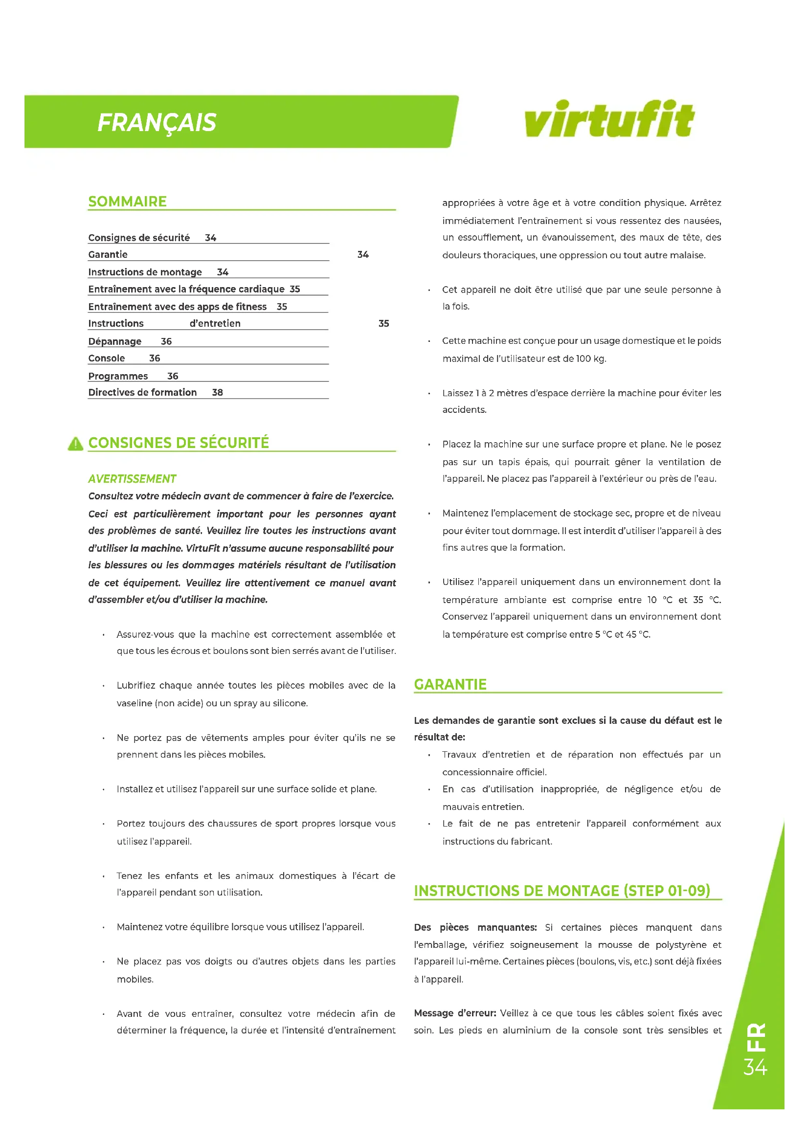 AVERTISSEMENT Consultez votre médecin avant de commencer à faire de l’exercice. Ceci est particulièrement important pour les personnes ayant des problèmes de santé. Veuillez lire toutes les instructions avant d’utiliser la machine. VirtuFit n’assume aucune responsabilité pour les blessures ou les dommages matériels résultant de l’utilisation de cet équipement. Veuillez lire attentivement ce manuel avant d’assembler et/ou d’utiliser la machine.
